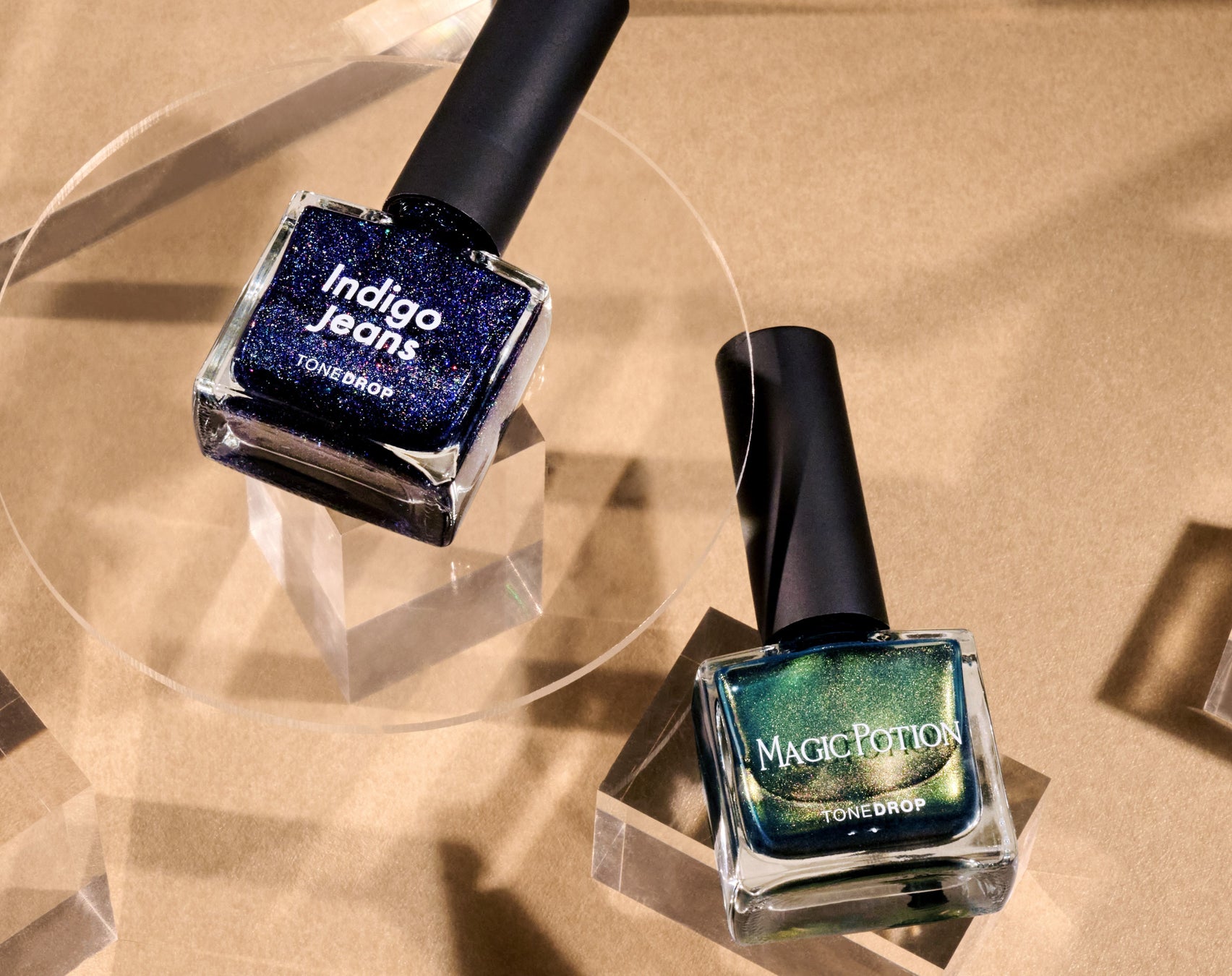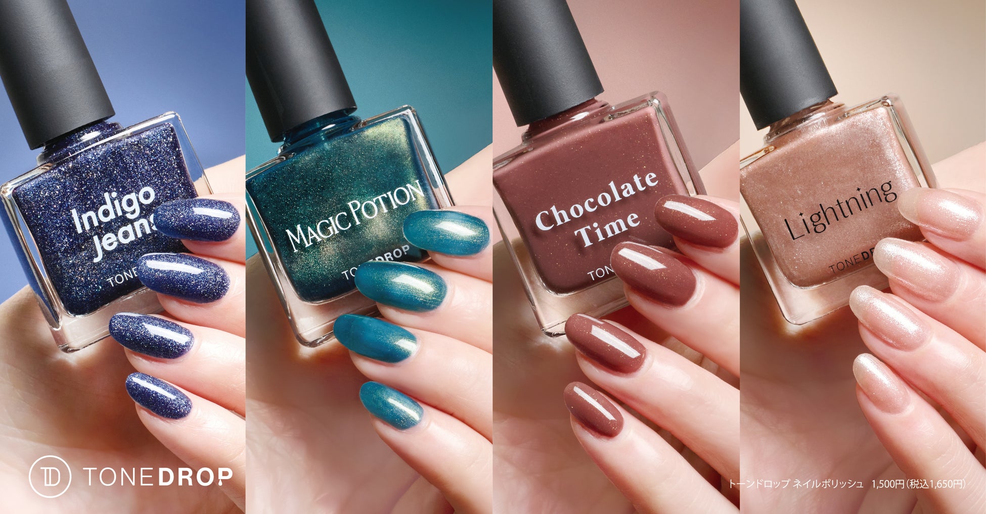 今期の秋冬トレンドはベーシックな使いやすい定番カラーに、きらめきや透け感などの遊び心を加えたスタイリング。特に深みのあるグリーンはトレンドのキーカラーになっています。新色「Magic Potion(マジックポーション)」は、そんなトレンドを意識しながらも、青みをプラスして渋くなりすぎない色合いに。そのほかの色も、ブラウン、シアーベージュ、インディゴブルーといったシーズンムードを高めるカラーを揃えました。TONEDROPならではの色が濁らないみずみずしい発色は、深みのあるカラーに奥行き感が出て、ボトルの見た目よりも軽やかな印象に仕上がります。