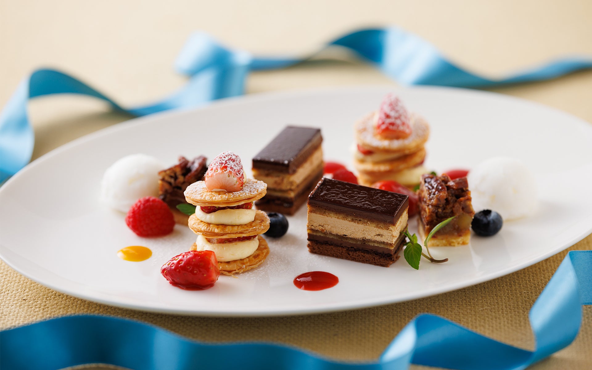 コースの最後は2名様のスイーツを1プレートに飾り、ご提供いたします。