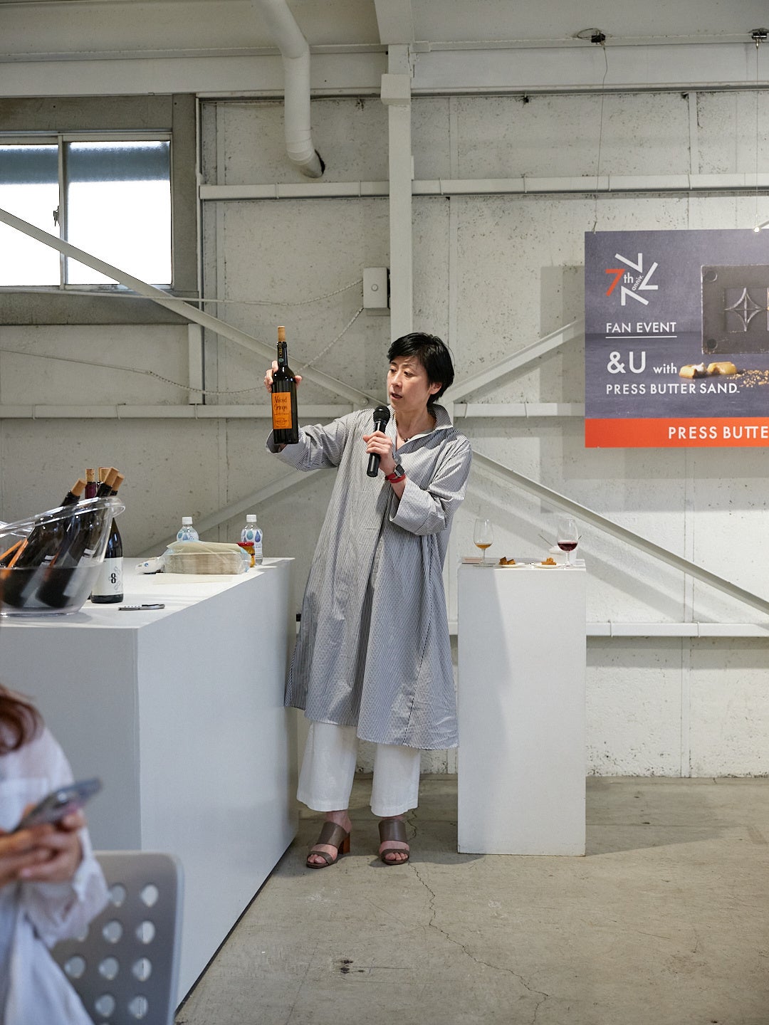 イベントの中盤では「PRESS BUTTER SAND」の新たな楽しみ方の提案として、ペアリング講座を実施しました。昼の部には飲料ユニット「香飲家」としても活躍し、コーヒー以外の分野まで領域を広げて活躍しているフリーランスバリスタの藤岡響さん、夜の部には「JSA認定ソムリエ」であり、数々の繁盛店を率いながら日本ワインの普及にも尽力してきた岩倉久恵さんを講師に招き、「バターサンド」と「バターサンド〈桃〉」をより美味しく食べられるペアリングを紹介していただきました。