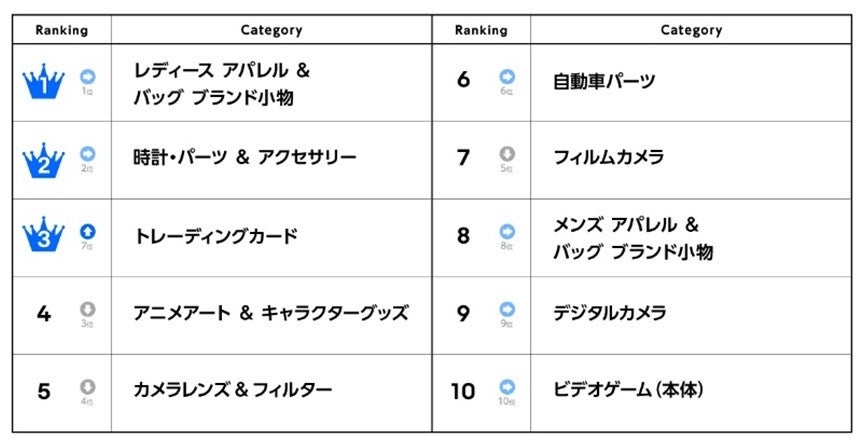 ・1位がレディースアパレル&バッグ ブランド小物、2位が時計・パーツ&アクセサリーと、昨年同期、昨年年間と同様の結果。