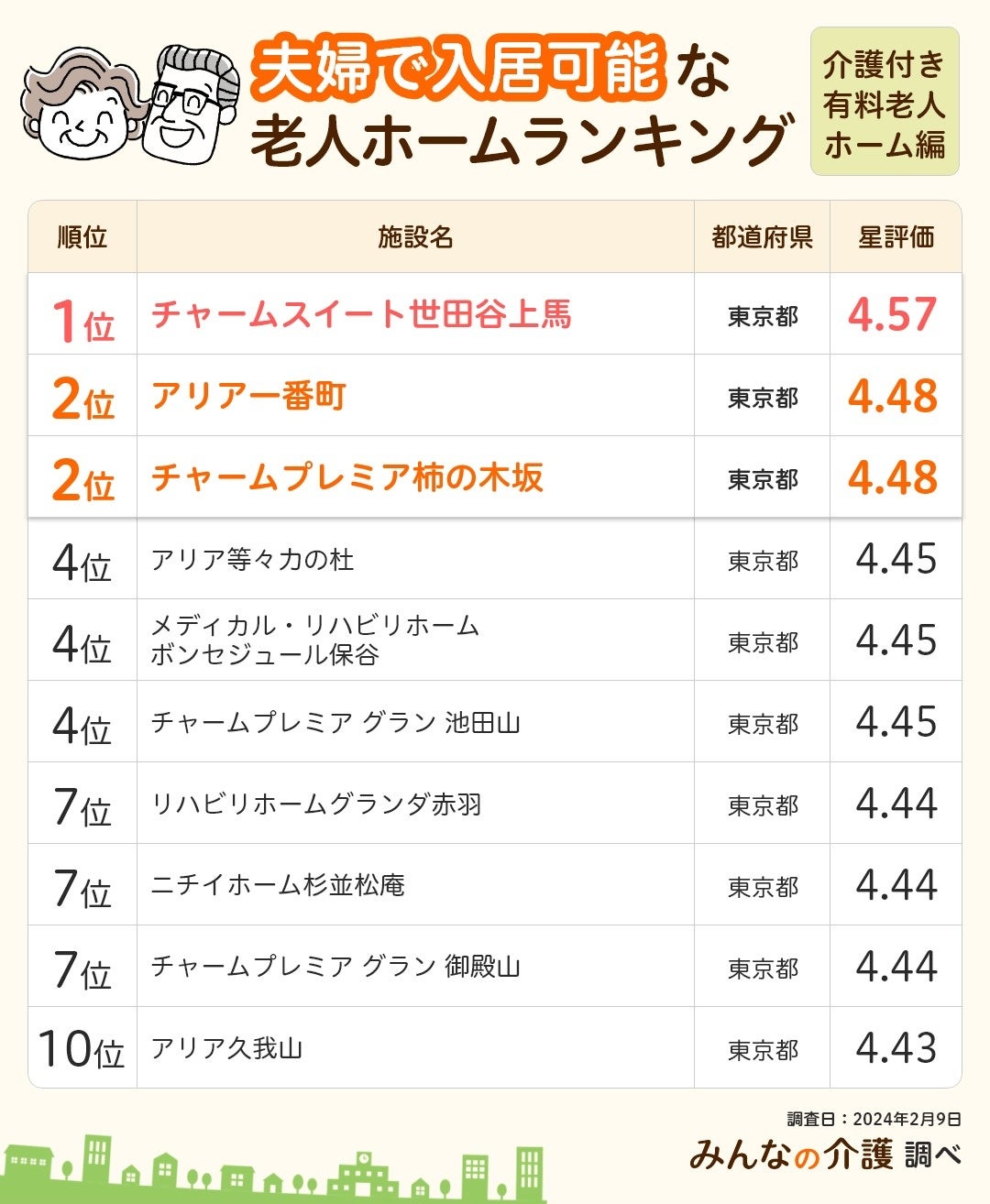 「みんなの介護」内に掲載している施設の中で、「夫婦入居可能な介護付き有料老人ホーム」は1,188件。1位に輝いたのは「チャームスイート世田谷上馬」でした。星評価・点数はランキングでも頭一つ抜けている「4.57」の高評価。同率2位の「アリア一番町」「チャームプレミア柿の木坂」(ともに4.48)に0.1ポイント弱差をつけました。「チャームスイート世田谷上馬」は、24時間介護スタッフが常駐し、入居者2.5人に対して1人以上のスタッフが配置。さらには定期的に協力医による往診や急病時にもすぐに連絡が取れる医療機関があるなど、入居者はもちろんご家族も安心できるサポート体制となっています。また、初詣や節分、ひな祭り、お花見など、四季折々の行事を楽しむイベントも。「マンションのような明るい雰囲気で、閉ざされた空間とならず、自宅のように過ごせそう」「部屋の綺麗さ、カフェや美容院スペース・檜風呂など充実し、外出含め自由度が高そう」などといった口コミもあり、全体的に満足度が高い施設で夫婦で充実した日々を送れそうです。