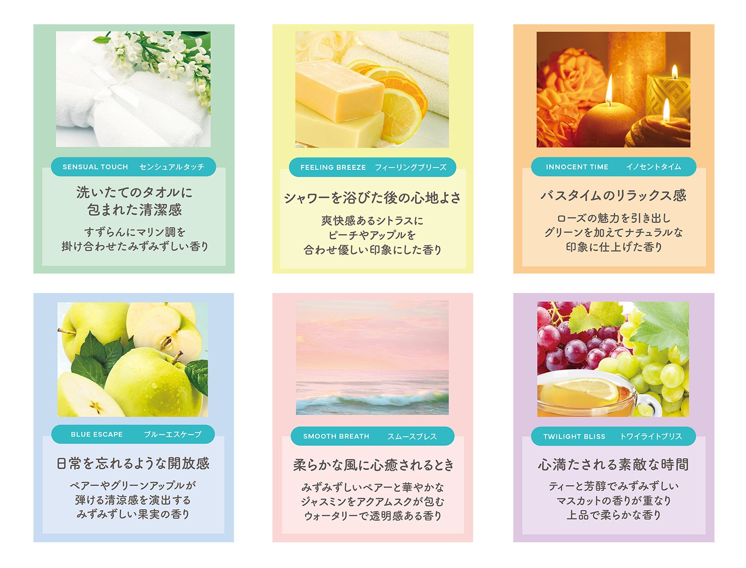 ベースにあるのは、多くの人に愛される上質なせっけんの香調。洗い立てのタオルのような清潔感あふれる香りから、リラックス感ある柔らかな香り、清涼感あるみずみずしい果実の香りなど、気分やシーンに合わせて選べる6種類を用意しました。