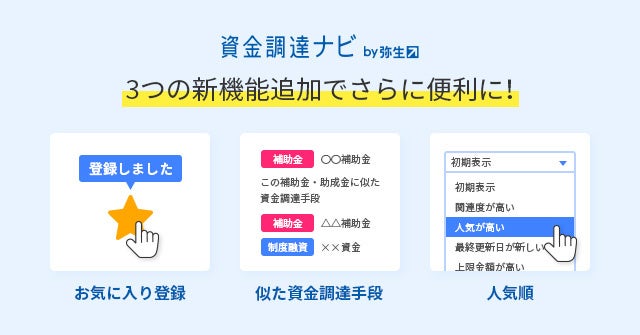 このたび「資金調達手段を検索」コンテンツに、「お気に入り登録」「似た資金調達手段」「人気順」の3つの新機能※1を追加しました。