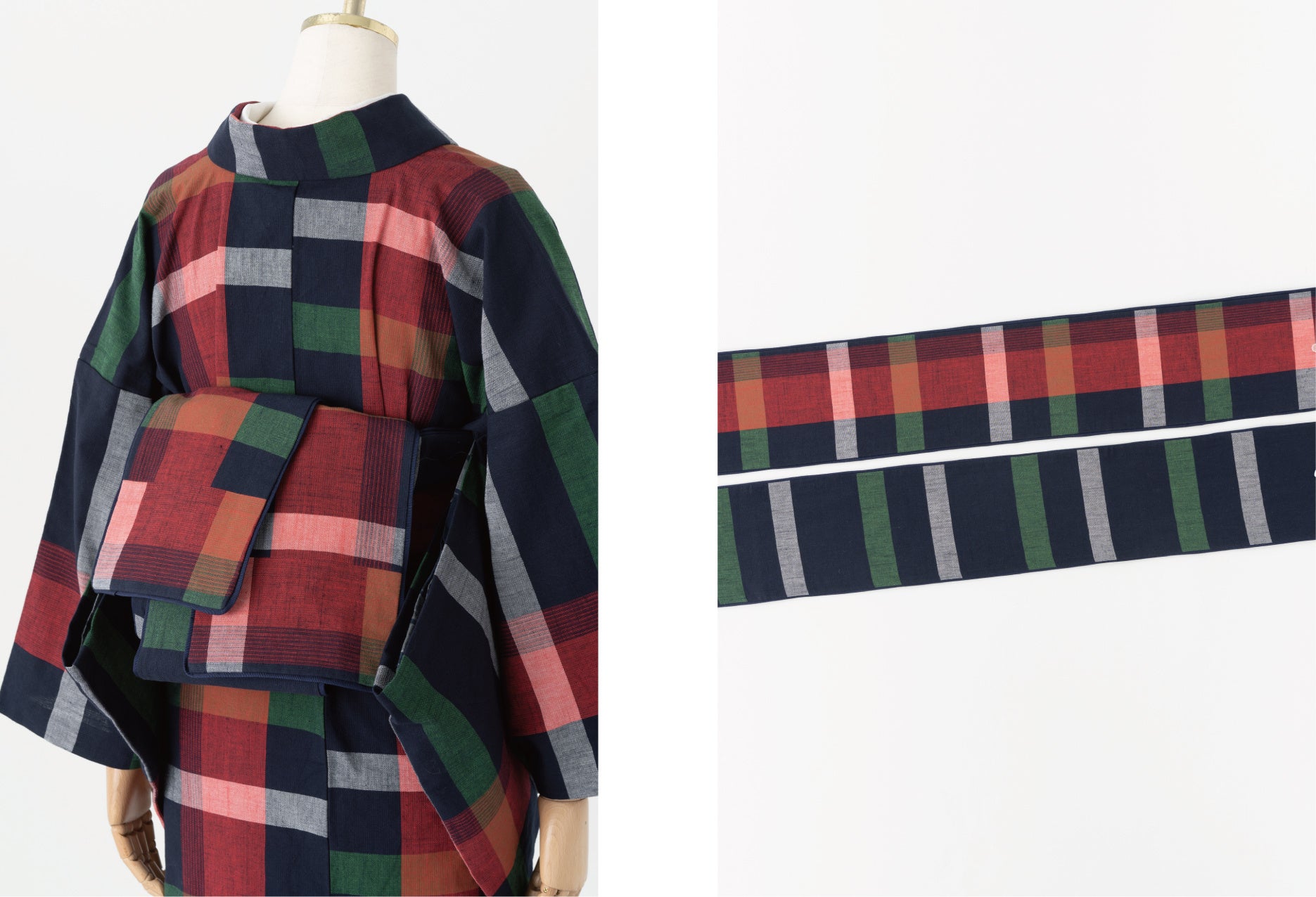 半巾帯は、どちらの面でも締めていただけるリバーシブルデザインとなっており、その日の気分やコーディネートに合わせてお好きな面をお使いいただけます。また、帯の縁に施したネイビーのパイピングもポイントとなっています。