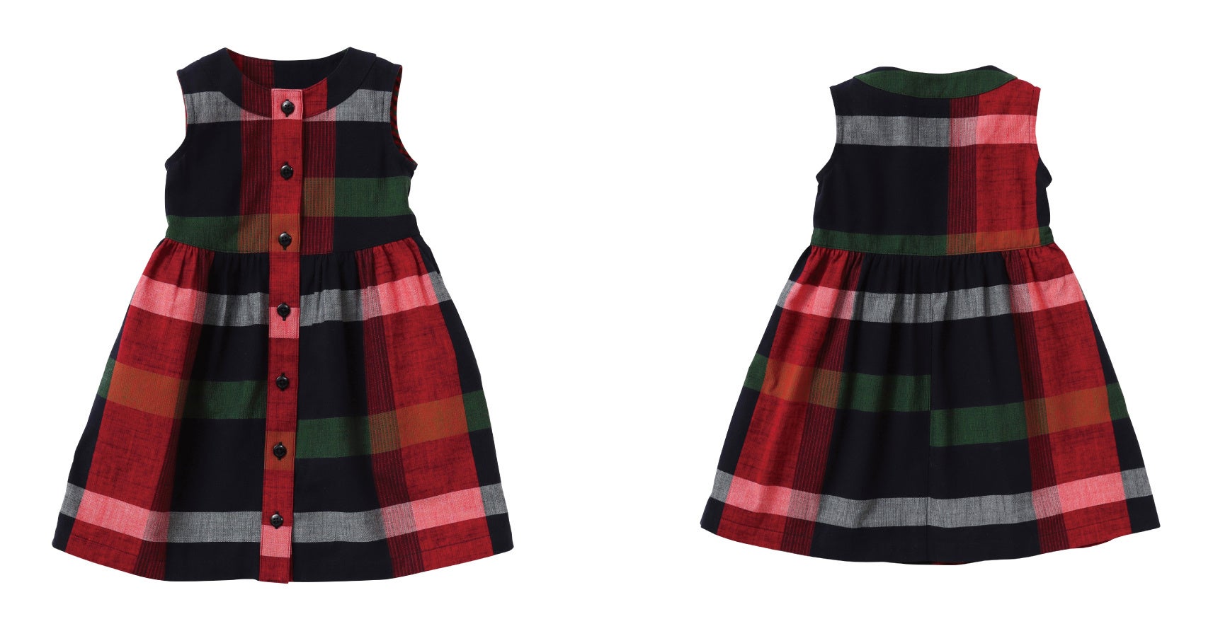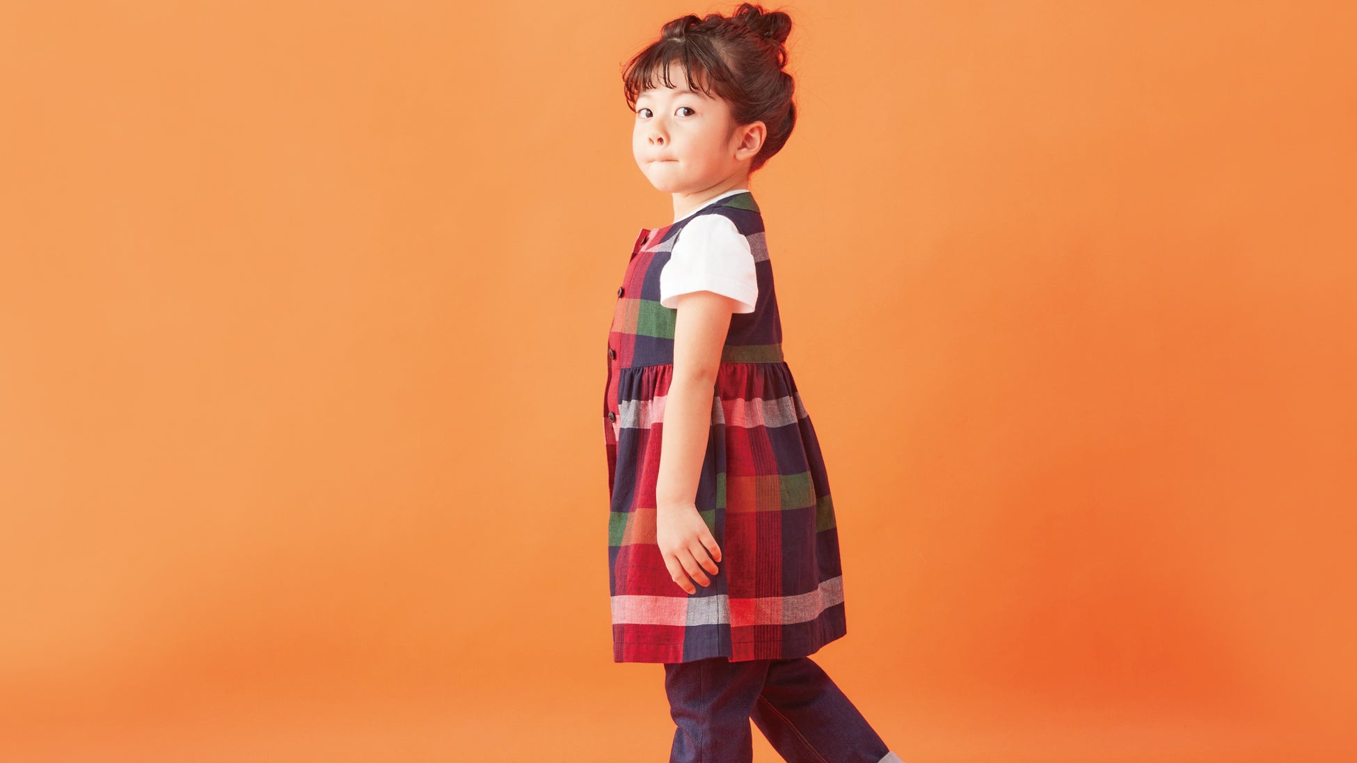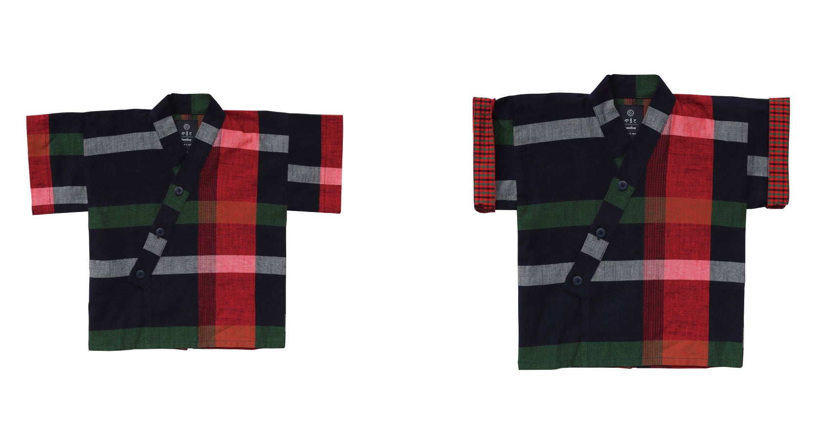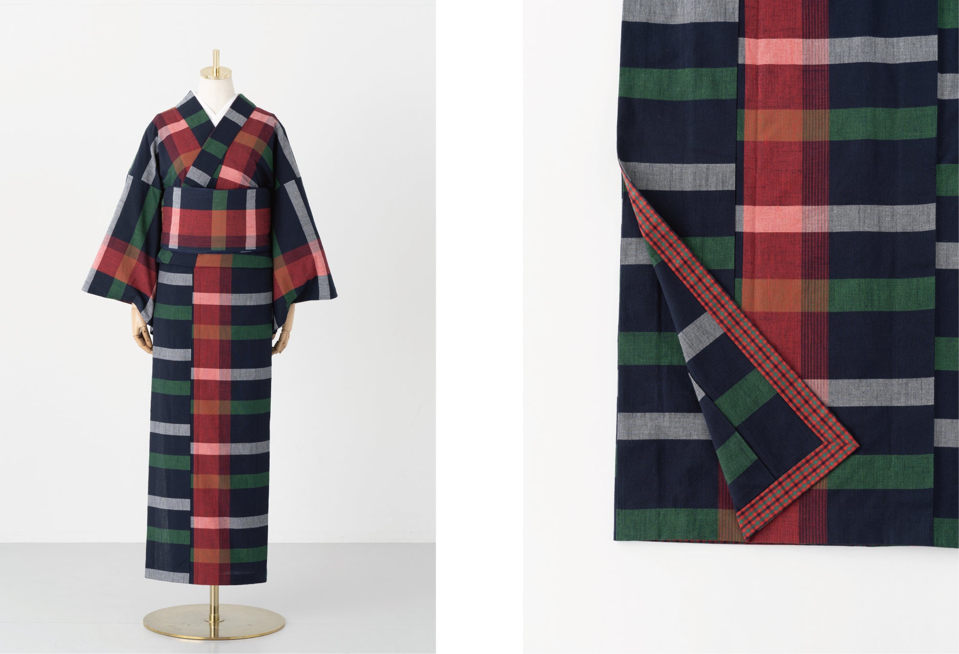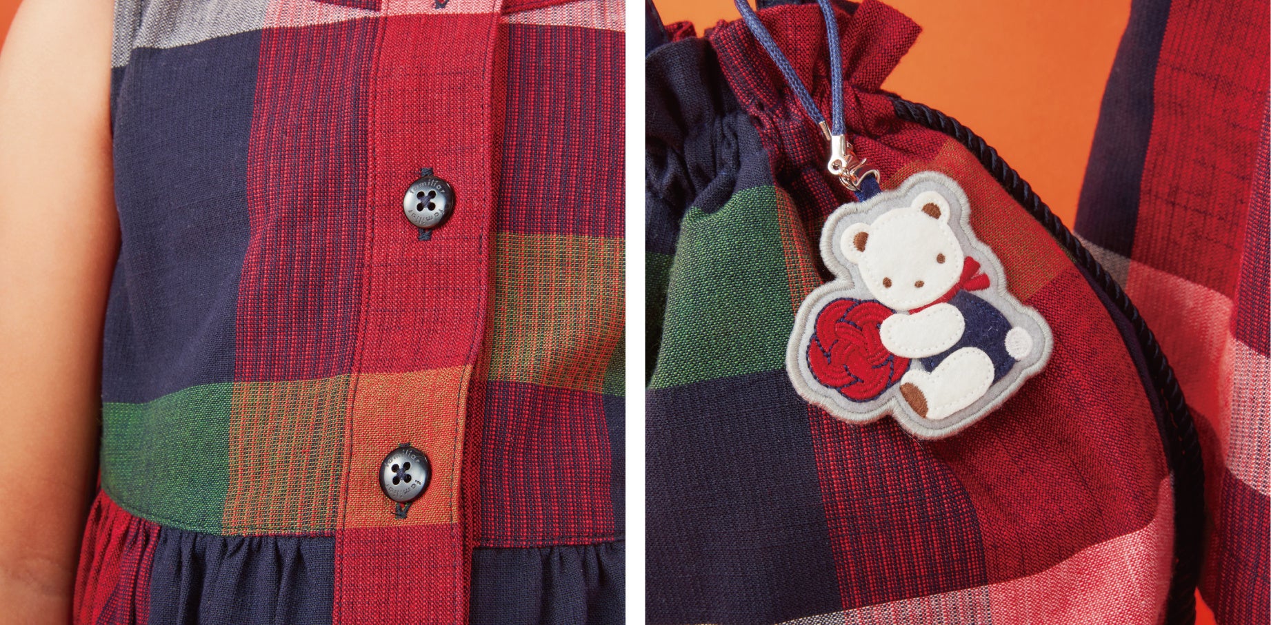 ファミリアチェックをベースにした、本コラボレーションのオリジナルデザインです。素材は、当社の木綿きものの定番として扱っている「片貝木綿」。お子様に着用していただくことを考え、何度も洗えて、着れば着るほど生地の風合いが柔らかくなる素材を採用しました。