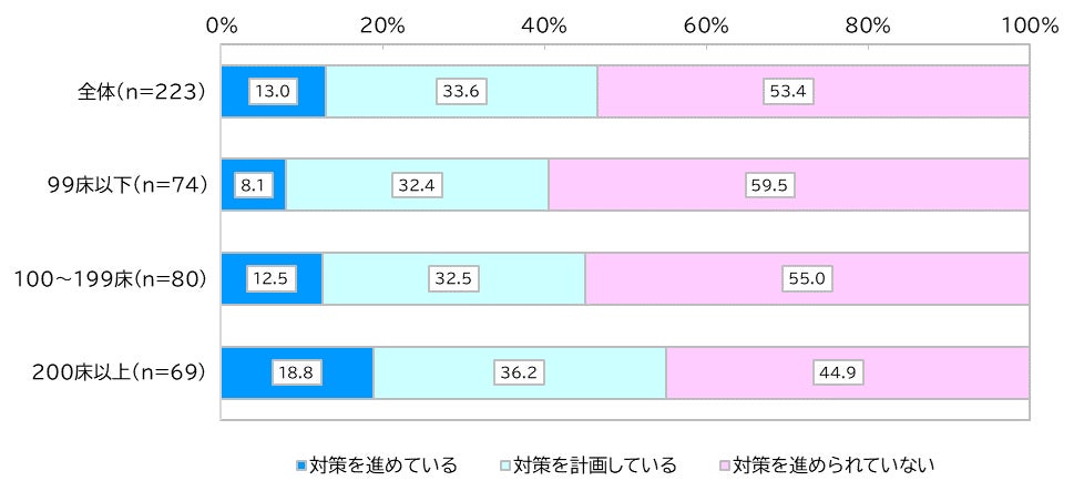 「対策を進めている」と回答したのは13.0%にとどまり、「対策を計画している」(33.6%)・「対策を進められていない」(53.4%)との回答が87.0%を占め、病院が将来に向けた対策が