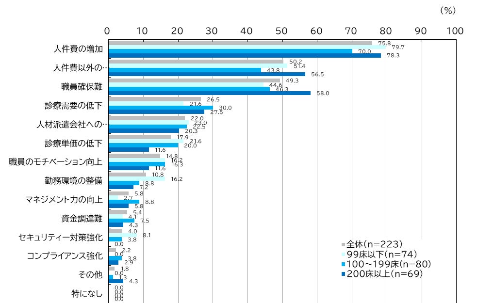 「人件費の増加」・「人件費以外の経費の増加」と回答する病院が50%を超え、経費の高騰が病院の経営課題となっている。労働集約型産業である病院は人手不足が深刻で「職員確保難」と約50%の病院が回答している。