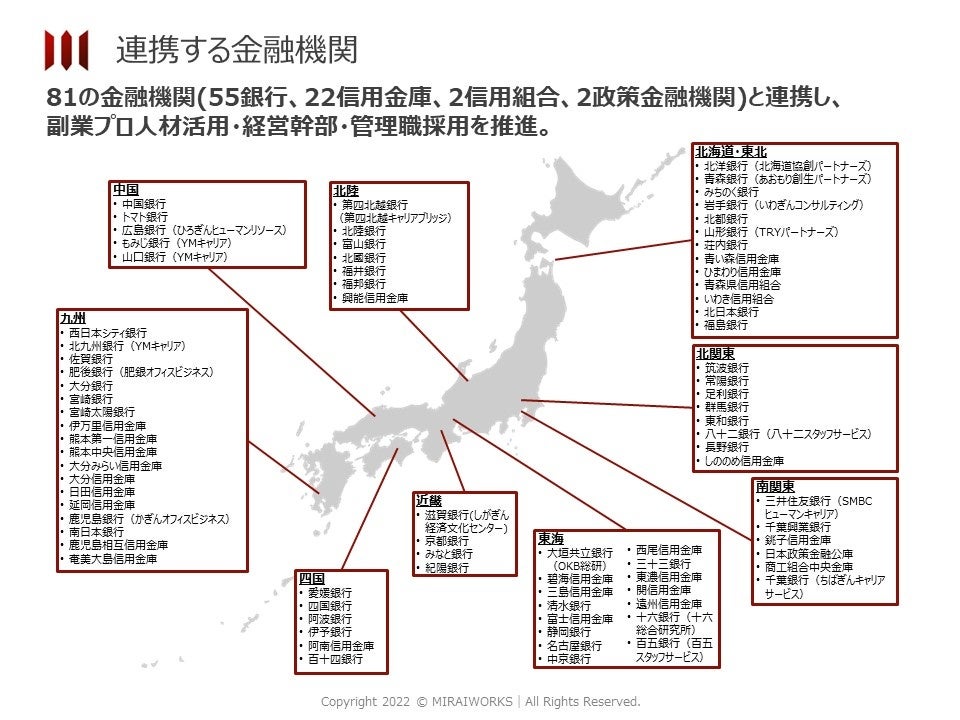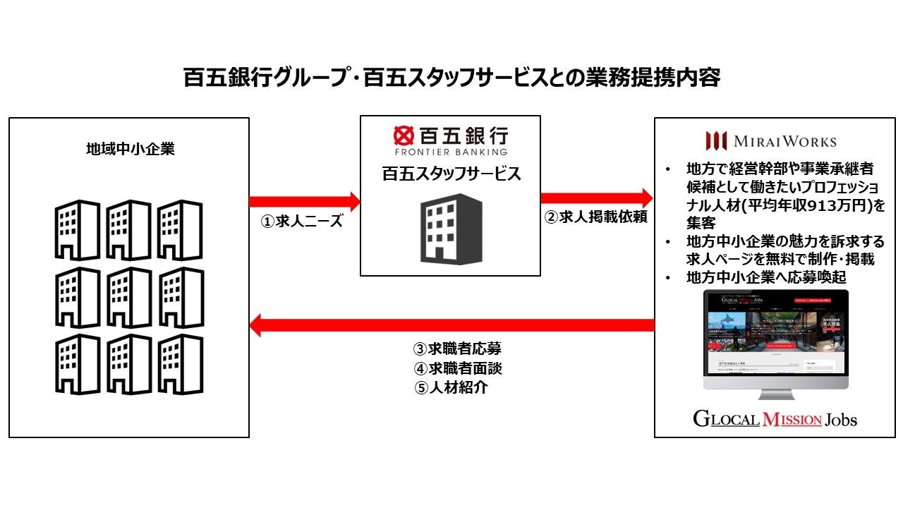 プロフェッショナル人材のフリーランス・副業といった多様な働き方をサポートする株式会社みらいワークス(本社:東京都港区、代表取締役社長:岡本祥治、証券コード:6563、以下「当社」)は、株式会社百五銀行(本店:三重県津市、取締役頭取:杉浦雅和)のグループ会社、百五スタッフサービス株式会社(所在地:三重県津市、代表取締役:佐藤新治、以下「百五スタッフサービス」)と人材支援による地域企業の事業強化を目的とした業務提携契約を締結したことをお知らせいたします。また、今回の百五スタッフサービスとの提携をもって、81の地域金融機関と地方転職・副業人材の活用を推進することとなります。
