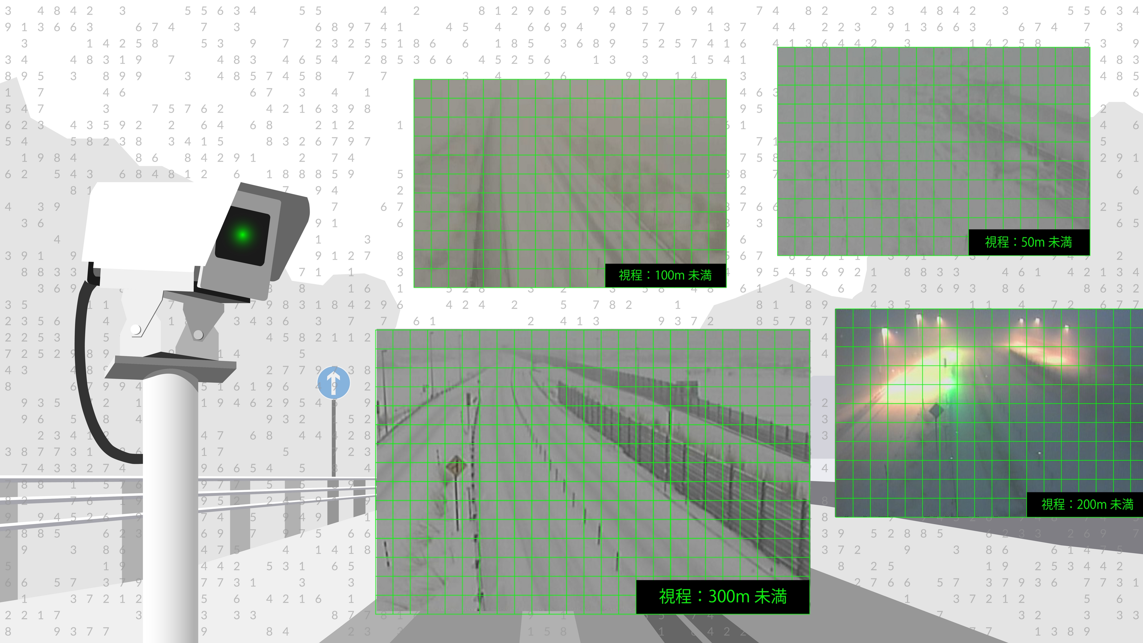 これまで道路の視程検知は、視程計の設置や、道路上に設置したカメラ画像を人が監視することによって行っており、大雪や吹雪による視程障害が毎年発生する中、道路管理者によるカメラ画像の目視による監視に頼らざるを得ませんでした。また、目視による判定結果は人によって異なるという課題もあります。