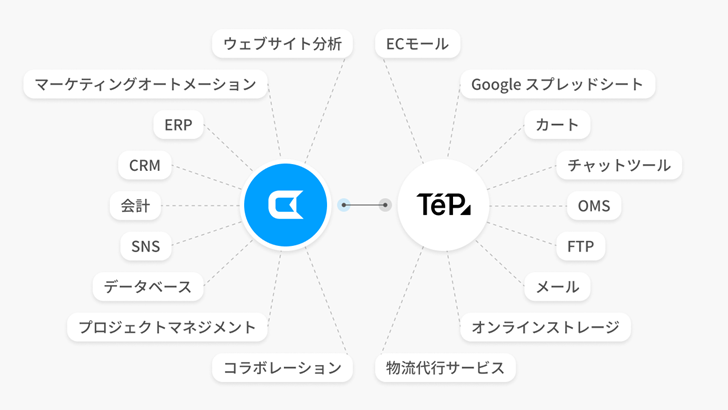 TēPs(https://teps.io/)は、API を介してEC モール、受注管理システム、Google スプレッドシートやチャットツールなど、日々の業務で利用するさまざまなサービスや機能を自由に組み合わせ、プログラミングの知識や経験がなくても、自社独自の業務を自動化できるiPaaS です。このたび、TēPs にCData Connect Cloud 経由で100種類以上のSaaS やDB のデータに連携する機能が追加されました。