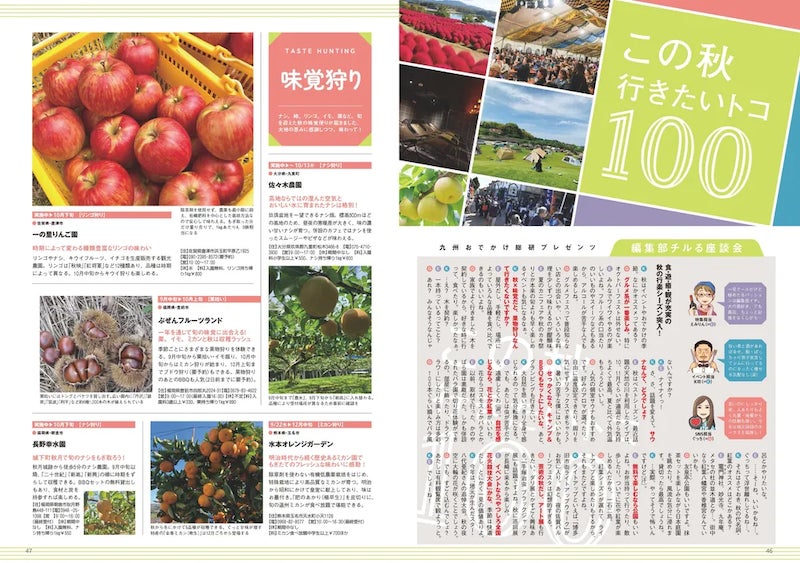 編集部メンバーが集まり、今おすすめの場所を議論・検討する「九州おでかけ総研」。「九州で秋に行くならココ!」という場所を100スポット集めました。味覚狩り、花名所、紅葉、グルメ、イベント、キャンプ&BBQ、サウナ、公園、アートの9ジャンルで、九州全域の秋の注目スポットをセレクト。編集部座談会では、今までの取材経験を活かし、その人気ぶりや、おすすめのポイントなども、トーク形式で楽しくお伝えします。