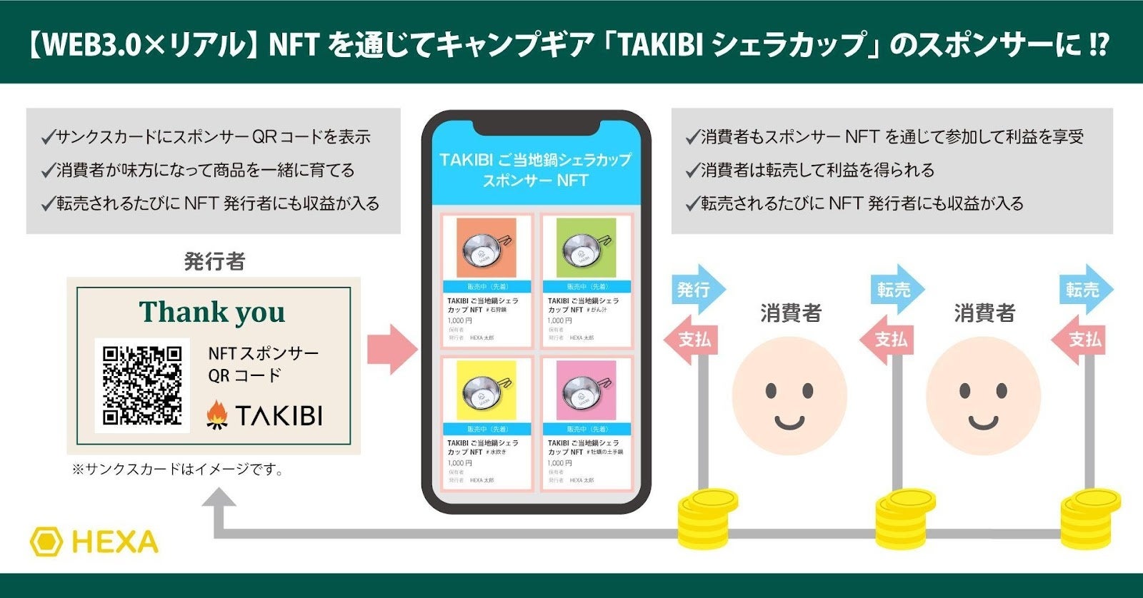今回作成したTAKIBIシェラカップに同梱されたサンクスカードに記載のQRコードから、ご当地鍋や郷土料理の名前が入った「TAKIBIシェラカップイラスト」のスポンサーNFTをご購入いただけます。