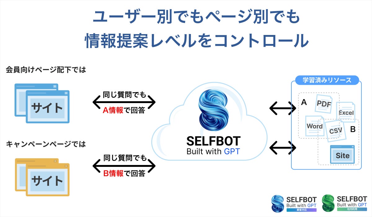 SELFBOT導入済み企業様からの要望が多かった学習済みリソースのChatGPTの回答において、ユーザー別、閲覧ページ別に、回答する情報をコントロールすることができる機能が登場しました。