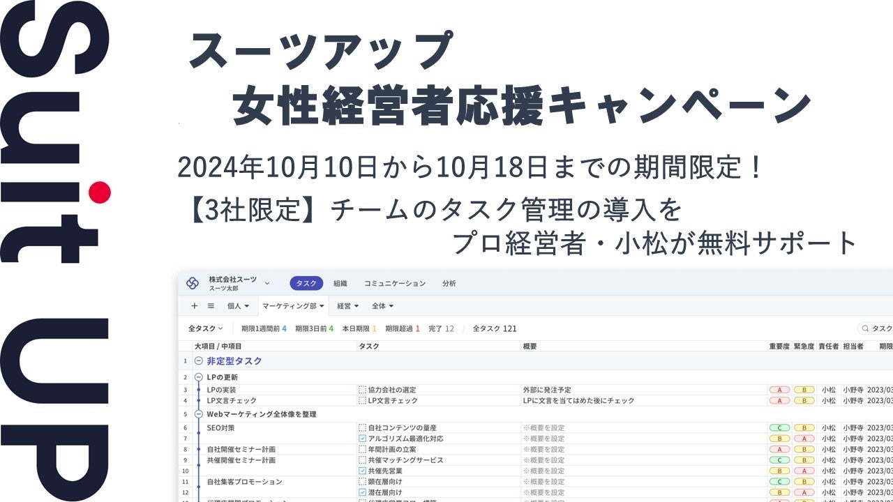 2024年10月10日から10月18日までの期間に、スーツアップの無料お試し30日にお申込みいただきました、女性経営者が社長を務める会社のうち3社限定で、当社代表者であり中小・中堅企業やスタートアップのバリューアップに実績のあるプロ経営者の小松自ら、チームのタスク管理の導入サポートを無料で行うキャンペーンを実施します。