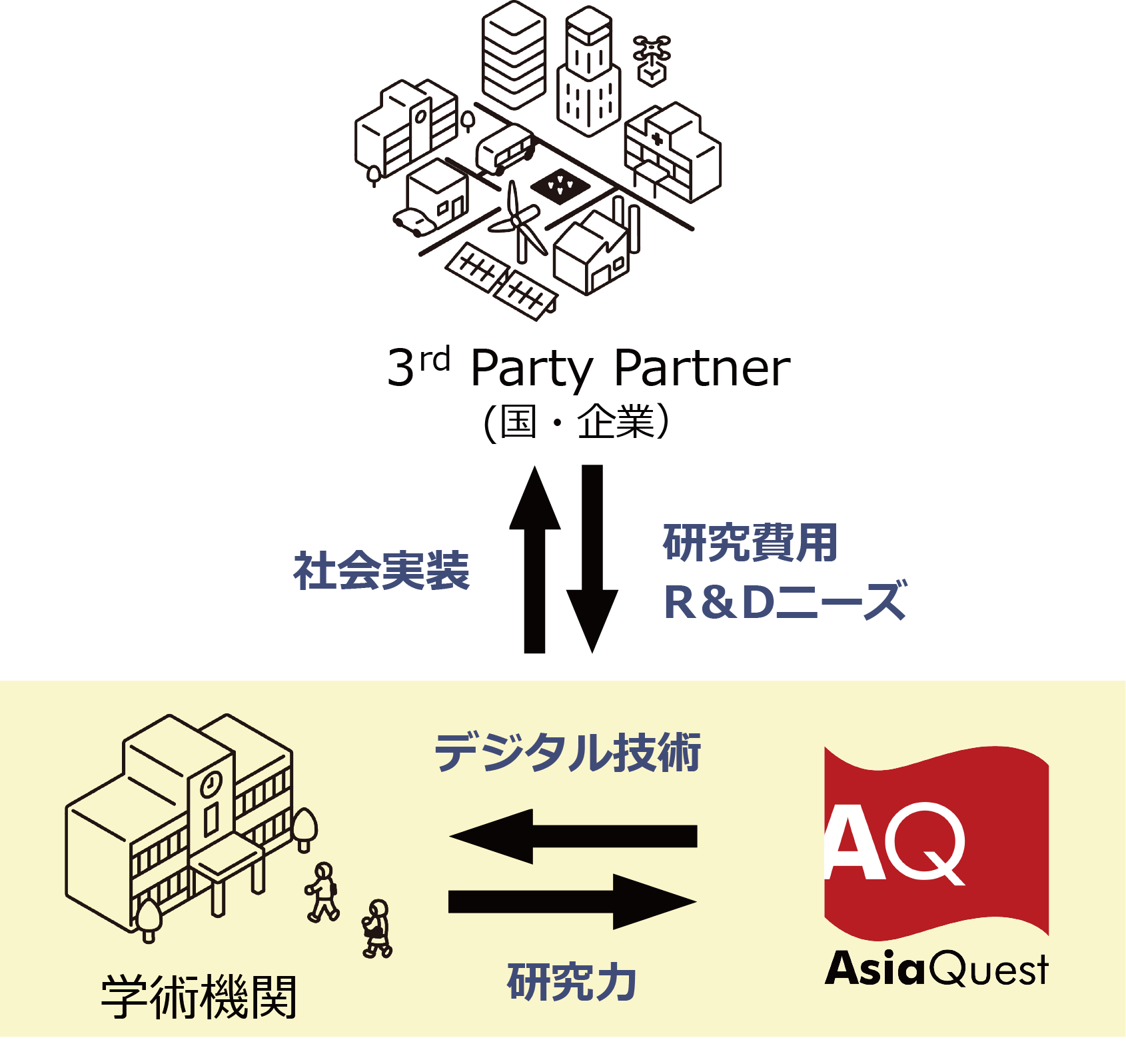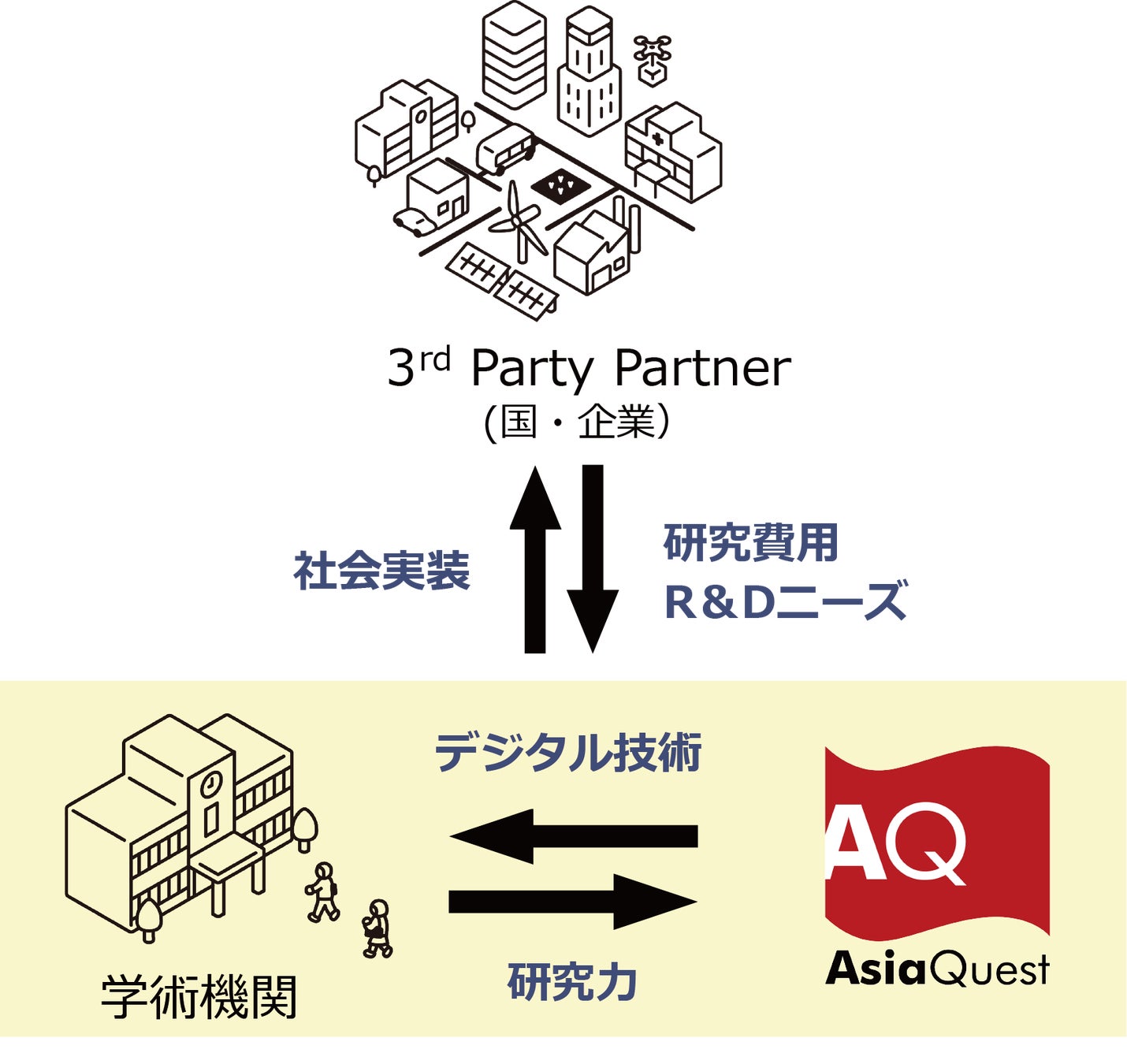 産業界では、課題を解決するための技術を持ち合わせていないがゆえに、取り残されている課題が多く存在しています。アジアクエストの開発技術と学術機関の基礎研究を繋ぎ合わせ、補完しあうことで、お互いの強みを活かし、企業・大学・社会全体への提供価値の最大化を目指してまいります。