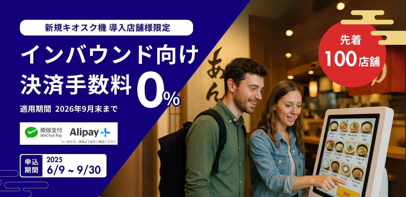 本キャンペーンでは、キオスク端末における海外QRコード決済利用時の決済手数料を0%とすることで、店舗におけるインバウンド対応を促進し、レジ業務削減による業務の効率化を支援いたします。