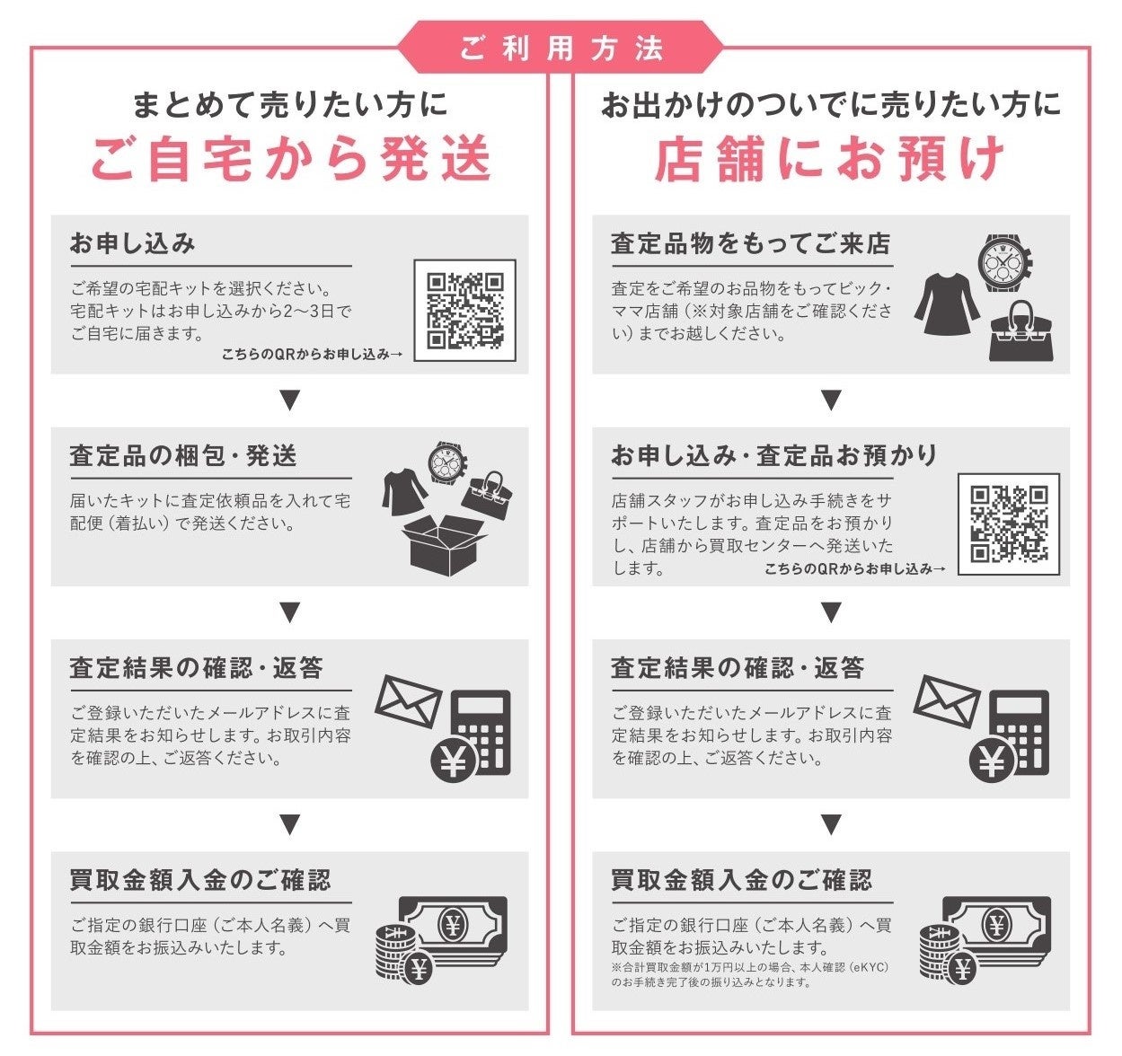 ビック・ママの対象店舗で査定品を預かり、店舗から買取センターへ発送します。店舗スタッフが買い取りの申し込みをサポートするので、梱包や発送が面倒な方、店舗に寄る“ついで”に不要品を売りたい方におすすめです。