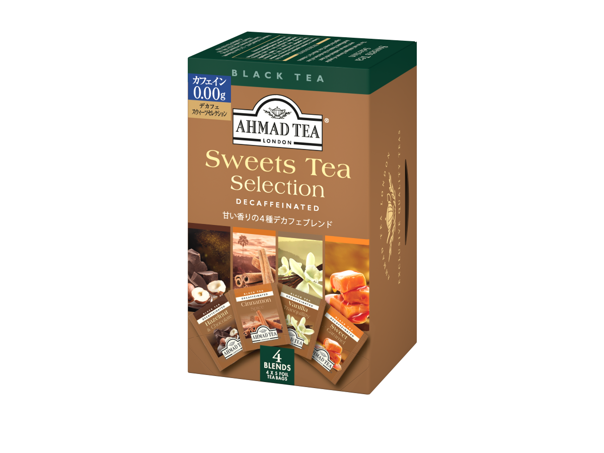 薬剤を使用することなく、二酸化炭素を使用した特殊なカフェイン除去方法で、安全性はもちろん風味や香りが損なわれにくいという特徴があります。『フルーツ セレクション』はアップル、ストロベリー、ピーチ&パッションフルーツ、レモン&ライムの4フレーバーのアソート、『スウィーツティー セレクション』はバニラ、キャラメル、シナモン、ヘーゼルナッツチョコレートの4フレーバーのアソートで、フレーバーの豊富さも特徴です。