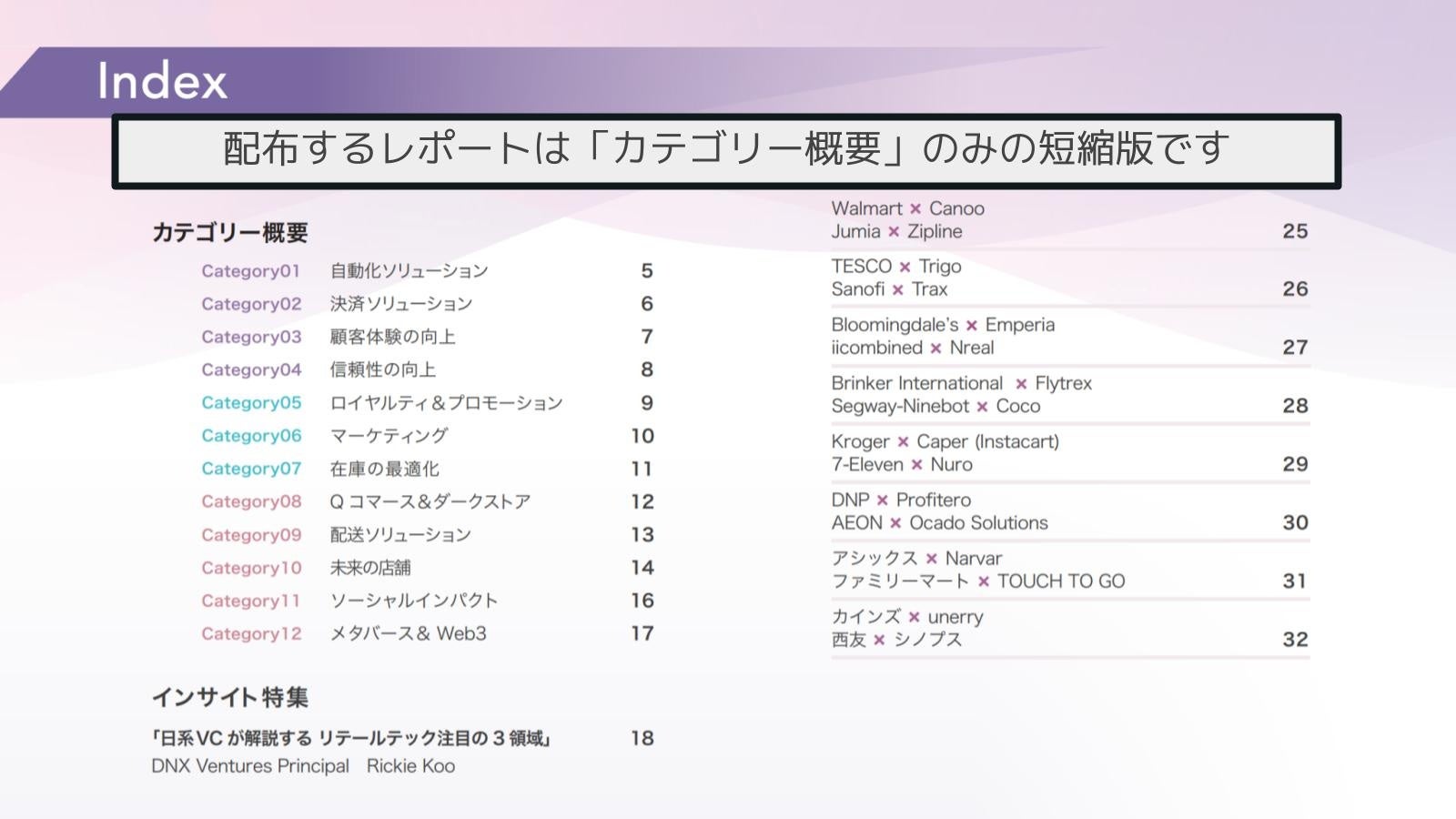 また、リテール領域の最新テックトレンドを紹介する「インサイト特集」として、TECHBLITZ主催「BLITZ SEMINAR」より、『日系VCが解説するリテールテック注目の3領域』の講演内容を掲載しています。巻末には国内外の大手企業によるスタートアップのソリューションの協業/導入事例をご紹介しています。
