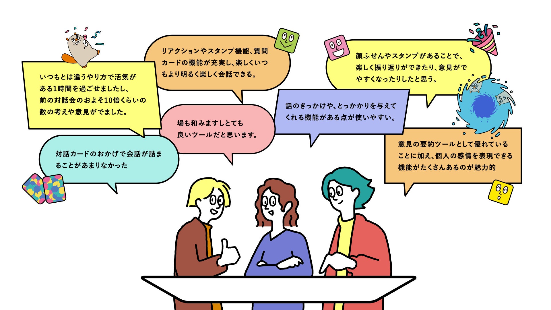 「Wevox Board」は、対話中に生じるキモチやコトバも可視化でき、リアクションやスタンプ機能、質問カードを駆使して、普段は見えない感情や心の動きを表現し、対話を通じて新たな気づきを深めることができます。