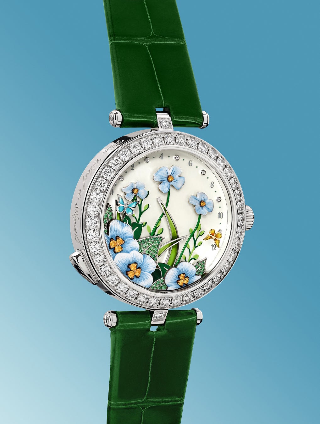ヴァロネ エナメルで彩られた花々は、ミニアチュール ペインティングによるブルーのグラデーションが印象的です。スペサタイトガーネットの雌しべが周りの花びらを明るく照らす一方、ツァボライトガーネットをちりばめた葉により、文字盤に広がる絵画のような風景の輝きが一層際立ちます。優美にしなる2枚の細長い葉には、やわらかなグリーンのプリカジュール エナメルが施され、背景に彩りを添えています。