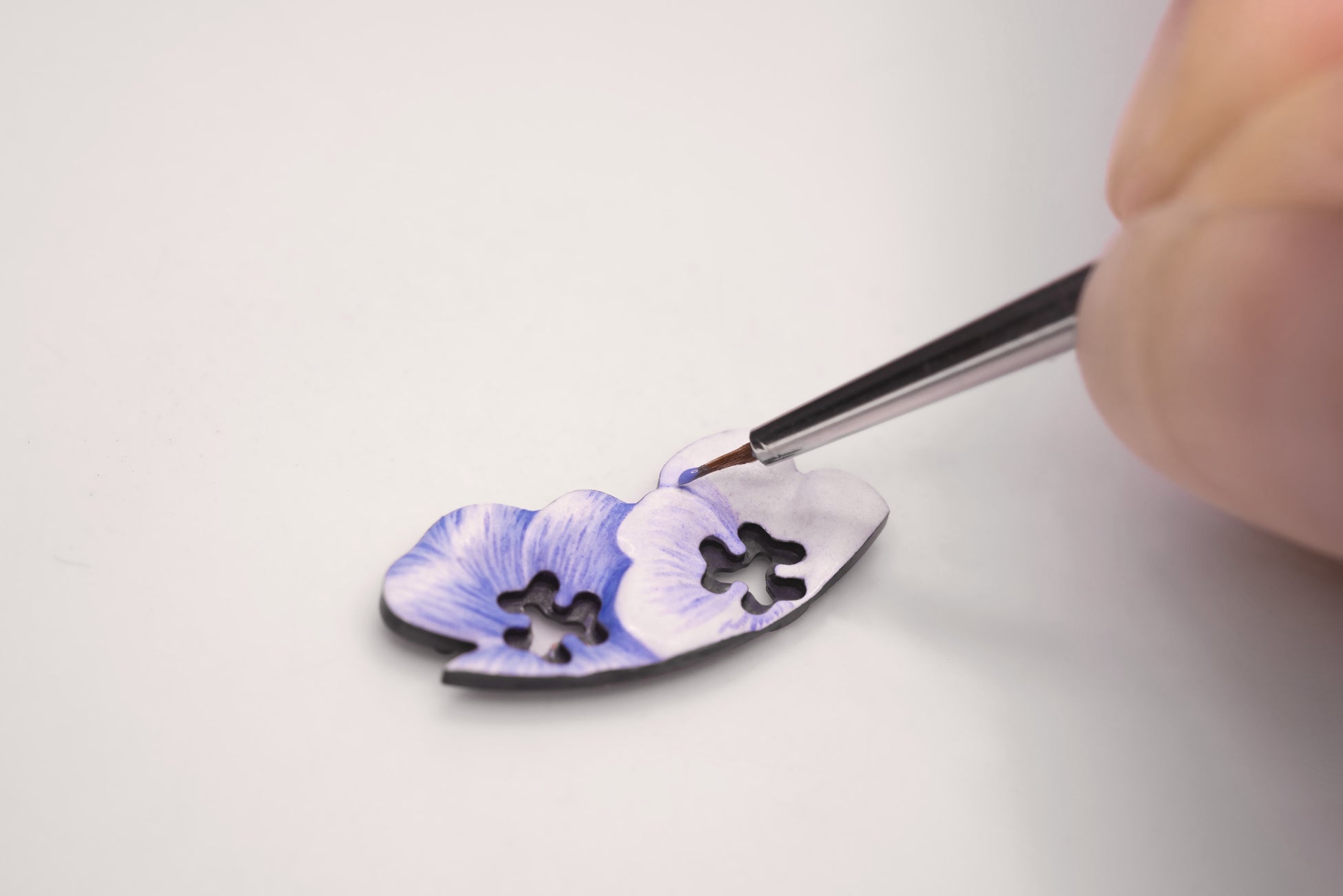 レディ アーペル ブリーズ デテでは、職人の手により、花びらはヴァロネ エナメルの技法で、蝶はプリカジュール エナメルで色付けされます。テン毛の細いブラシを駆使することで、繊細な色彩のグラデーションを生み出しています。着色のプロセスでは、明るいトーンのものから深みのある色調へと、極めて正確な順序で一色ずつ塗布していきます。ひとつの色を塗るごとに焼成を必要とし、その時間と温度を判断できるのは経験豊富なエナメル職人に限られます。