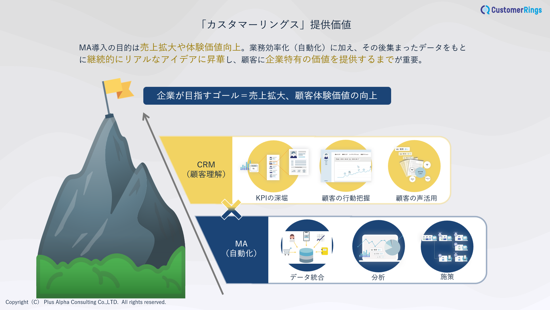 「カスタマーリングス(https://www.customer-rings.com/)」は、顧客1人1人を見える化し、確実にPDCAサイクルを回すことが出来るマーケティングプラットフォームです。これまで750社以上に導入されており、豊富なコンサルティング経験から培ったCRM(顧客管理・分析・活用)ノウハウと、データマイニングなどの分析技術を凝縮したMA(マーケティングオートメーション)の2つを融合させ、最新のマーケティングトレンドに合わせて進化してきました。