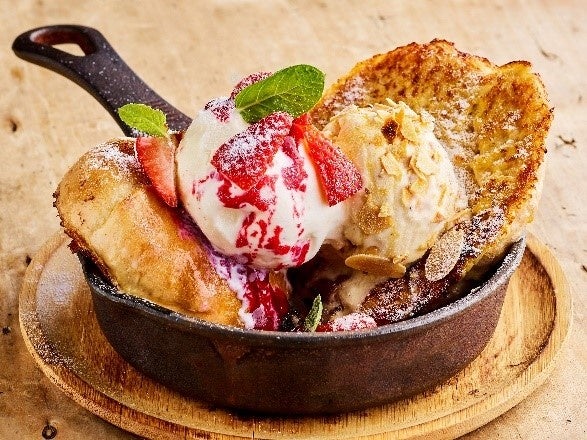 一般的に食パンやフランスパンが使われるフレンチトーストを、ベーグルで作ったパンスクオリジナルメニュー。もちもち、ふわふわと食感の異なるベーグルに、マスカルポーネアイスクリーム&ベリー、塩キャラメルアイスクリーム&ナッツの2つの味を組み合わせて楽しめます。