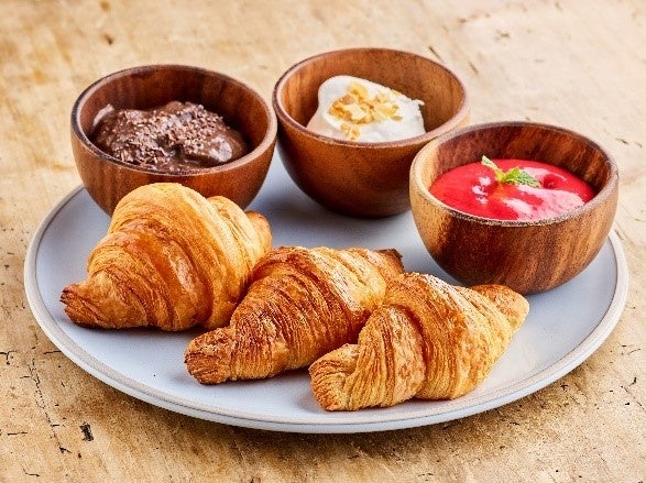 パンスク会員に1番人気のパン“クロワッサン”を食べ比べできるプレート。ショコラエスプーマ、クレームシャンティ、フランボワーズエスプーマ、の3種類のクリームをパレットのように好みの配合でディップ。