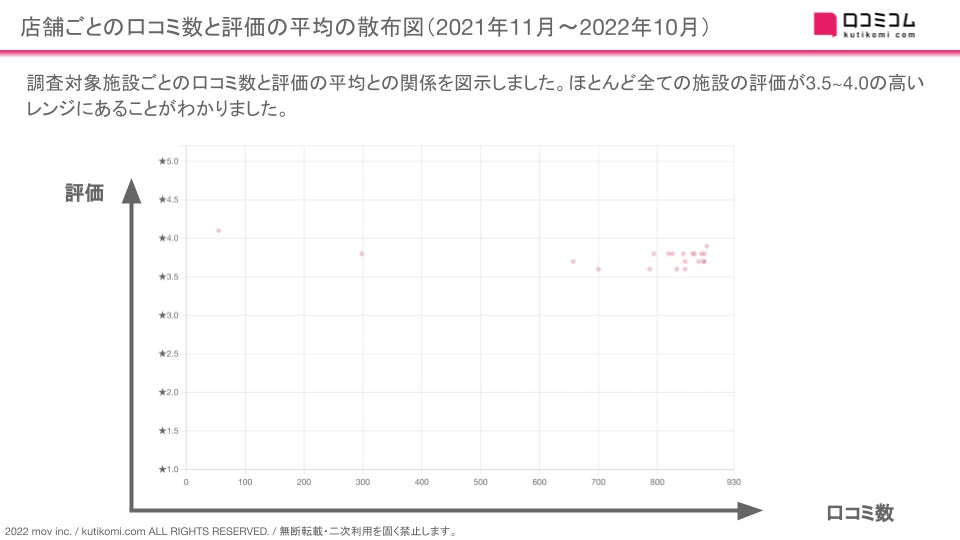 口コミ件数・評価の散布図を作成したところ、全体的に★3.5以上の良い評価が集まる傾向にあること、件数は施設によりばらつきがあるものの、600件以上と多くの口コミが集まっている施設が多いことがわかりました。