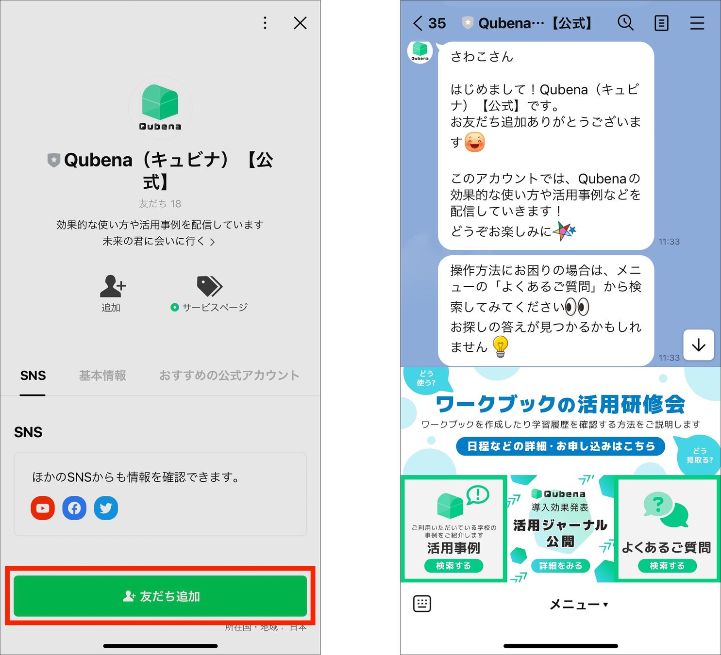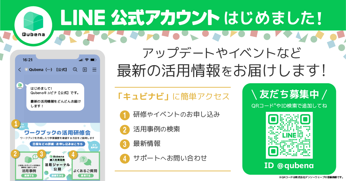 Qubenaはこれまで、ご導入の自治体・学校の教職員様に向けて、Qubenaの活用ナビサイト「Qubena Navi(キュビナビ)」にてQubenaの活用に役立つ情報をお届けしてまいりました。このたび、Qubenaの最新情報をお手元にいち早くお届けするために、LINE公式アカウントを開設いたしました。アップデートやイベントなどQubenaの最新情報を配信、活用事例の検索やお問い合わせなどにLINEから簡単にアクセスすることができるようになっております。ぜひ友だち追加をお願いいたします。