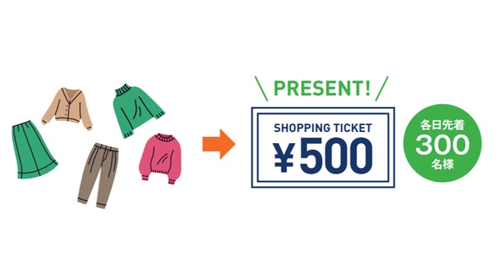 不要になった衣料品5着以上の回収にご協力いただいた各日先着300名のお客様に、コクーンシティで使えるお買物券500円分をプレゼント!回収した衣類は品質・素材に応じて、リユースまたはリサイクルさせていただきます!