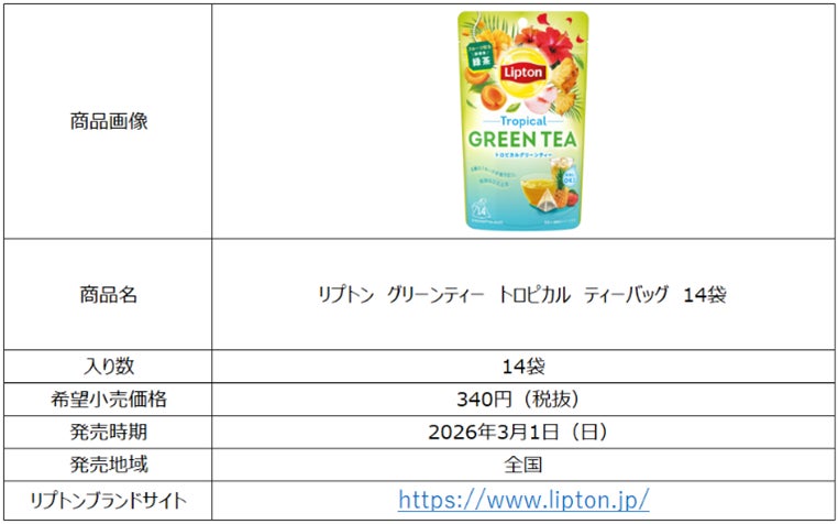 紅茶ブランド「リプトン」は、2025年秋に発売しご好評をいただいているグリーンティーシリーズの新商品として、「リプトン グリーンティー トロピカル ティーバッグ 14袋」を、2026年3月1日(日) より全国のスーパーマーケット等の量販店、一般小売店等で発売いたします。