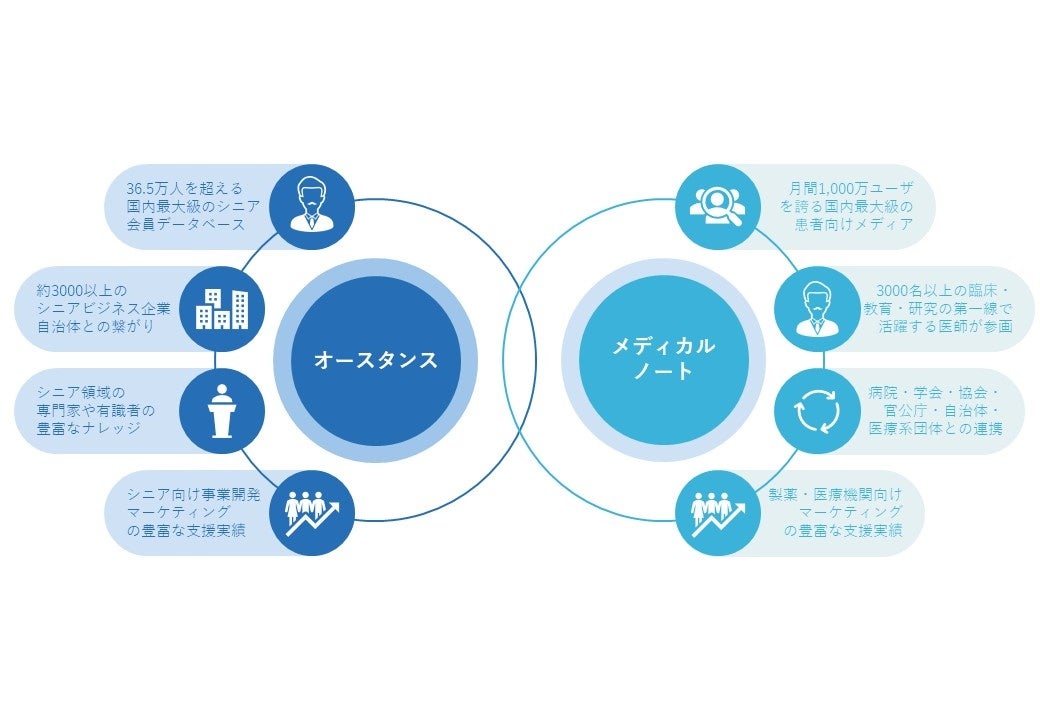 メディカルノートが保有している医療ナレッジや、医療検索のデータベースによる知見と、オースタンスが保有しているシニア世代を行動変容させるナレッジや、会員データベースによる知見、それぞれのナレッジとデータベースの連携を行います。その結果、高齢者×医療領域において最適なアプローチを提供します。