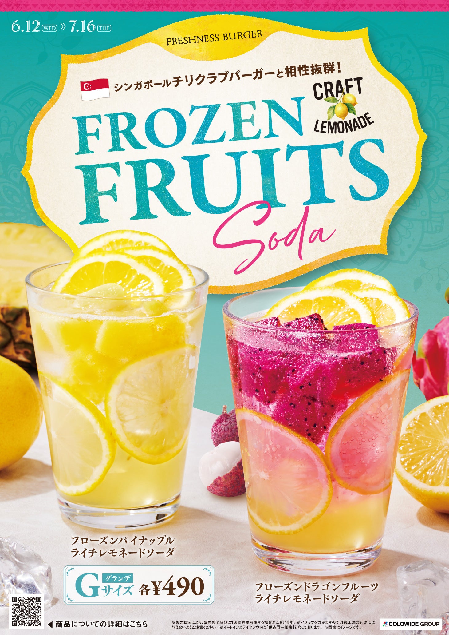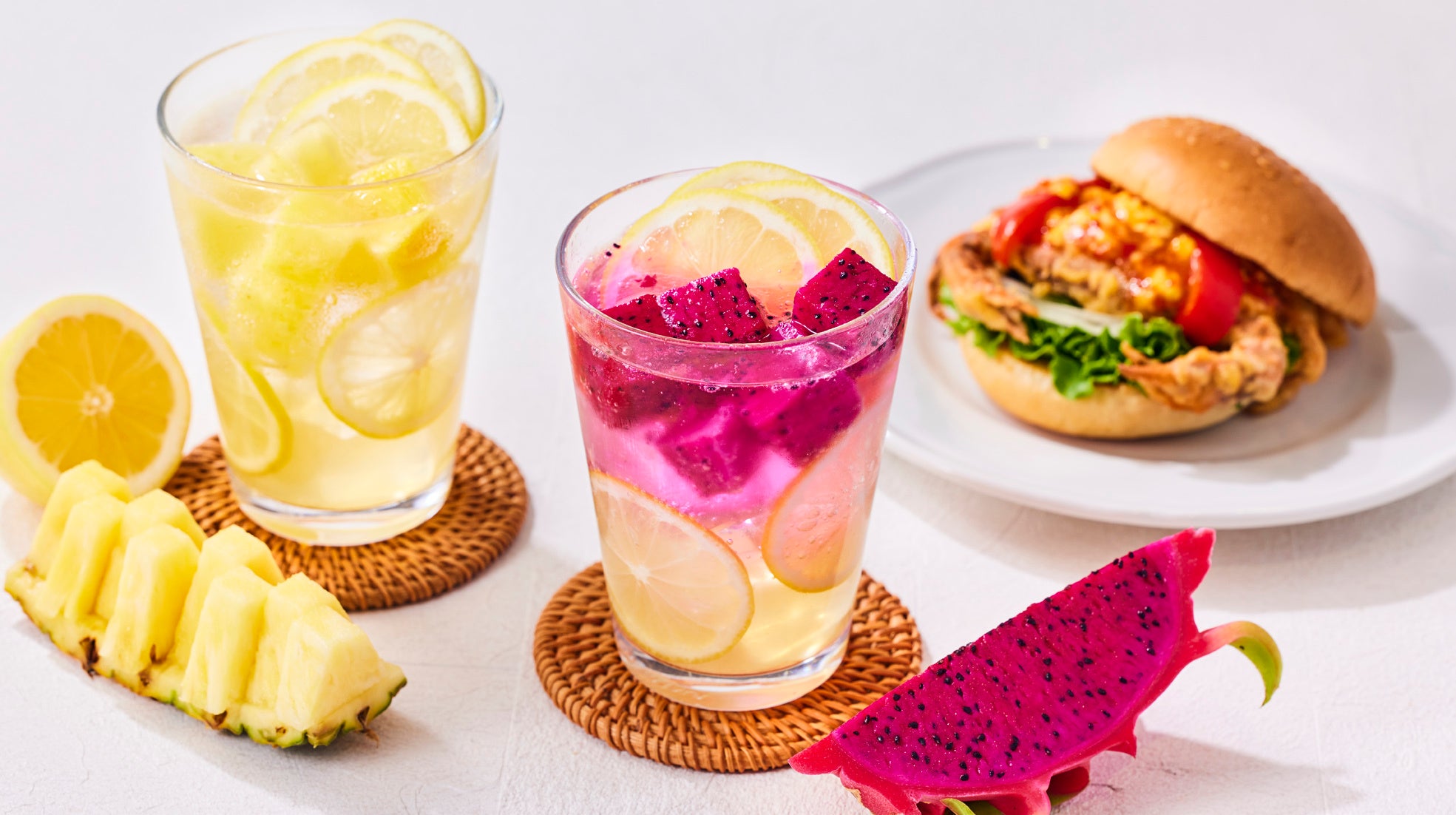 今回は、期間限定ハンバーガー「シンガポールチリクラブバーガー」に合わせて、シンガポールの都会的な常夏を彷彿とさせるドラゴンフルーツやパイナップルを使いました。店内でじっくりとはちみつに漬け込んだレモンスライスと凍らせたドラゴンフルーツに、ライチシロップが入った「フローズンドラゴンフルーツ ライチレモネードソーダ」と、同じくはちみつ漬けレモンスライスと凍らせたパイナップル、ライチシロップが入った、「フローズンパイナップル ライチレモネードソーダ」の2種類をご用意いたしました。本作にパイナップルを使用することと、ライチシロップを使うのは初めてとなります。