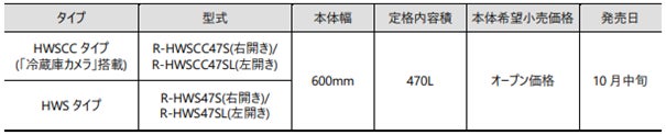 また今回は、「冷蔵庫カメラ」非搭載の「まんなか冷凍 HWSタイプ」R-HWS47S (定格内容積470L)を同時発売します。