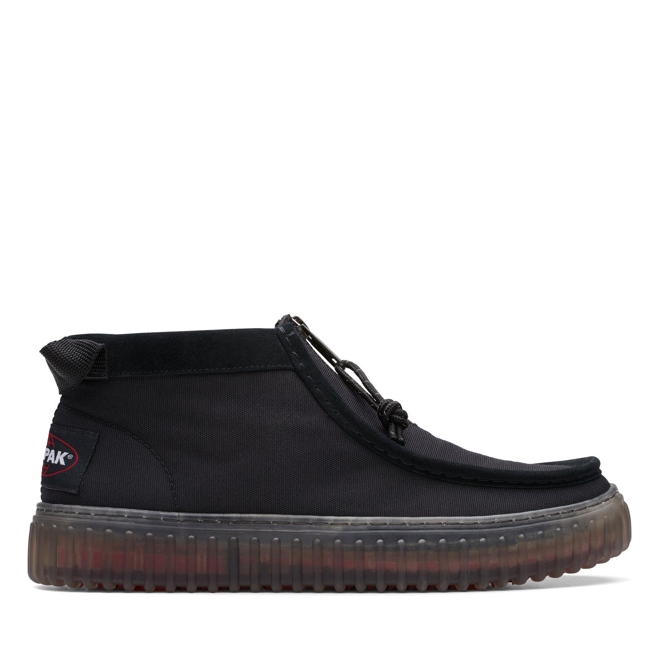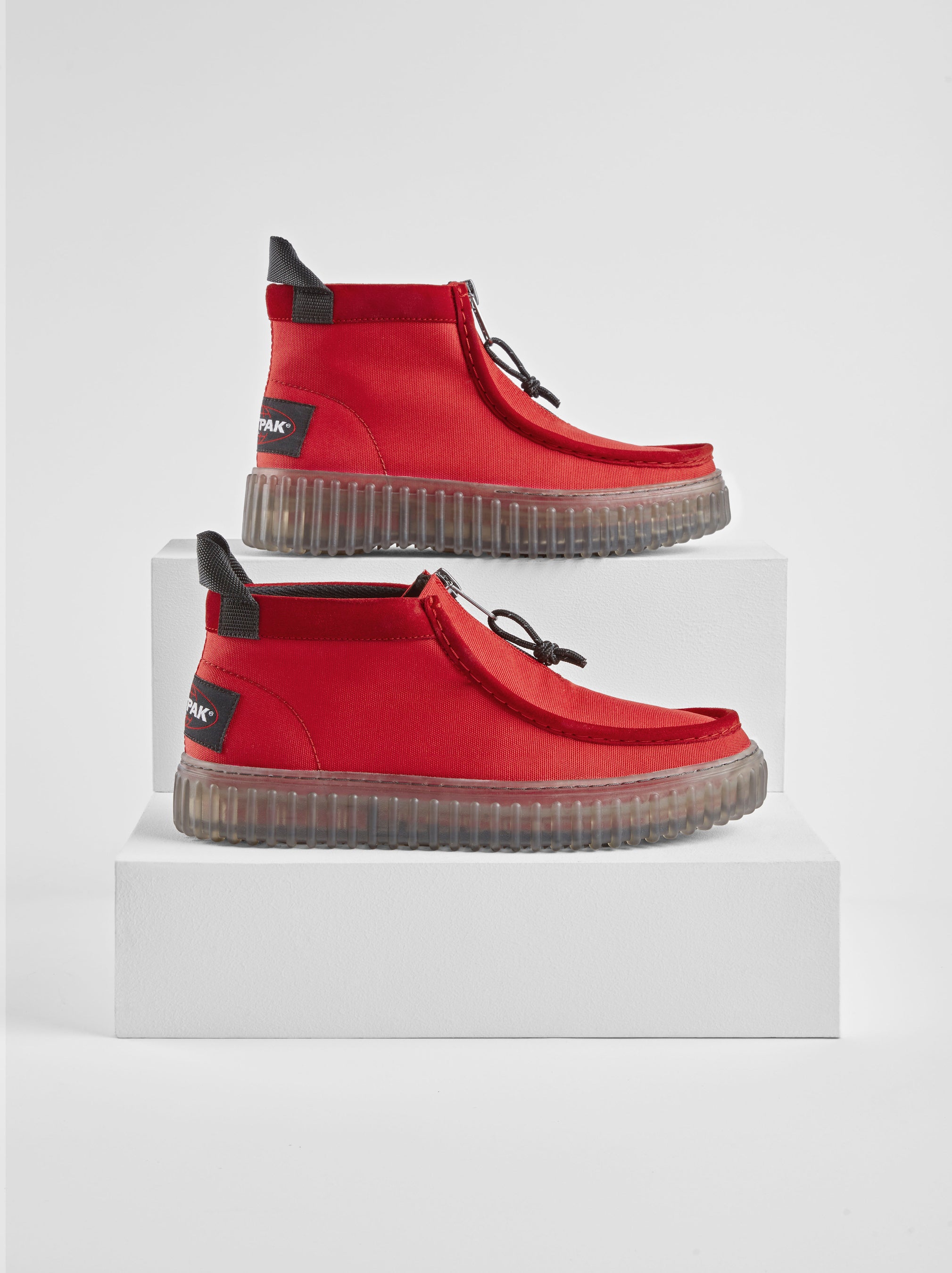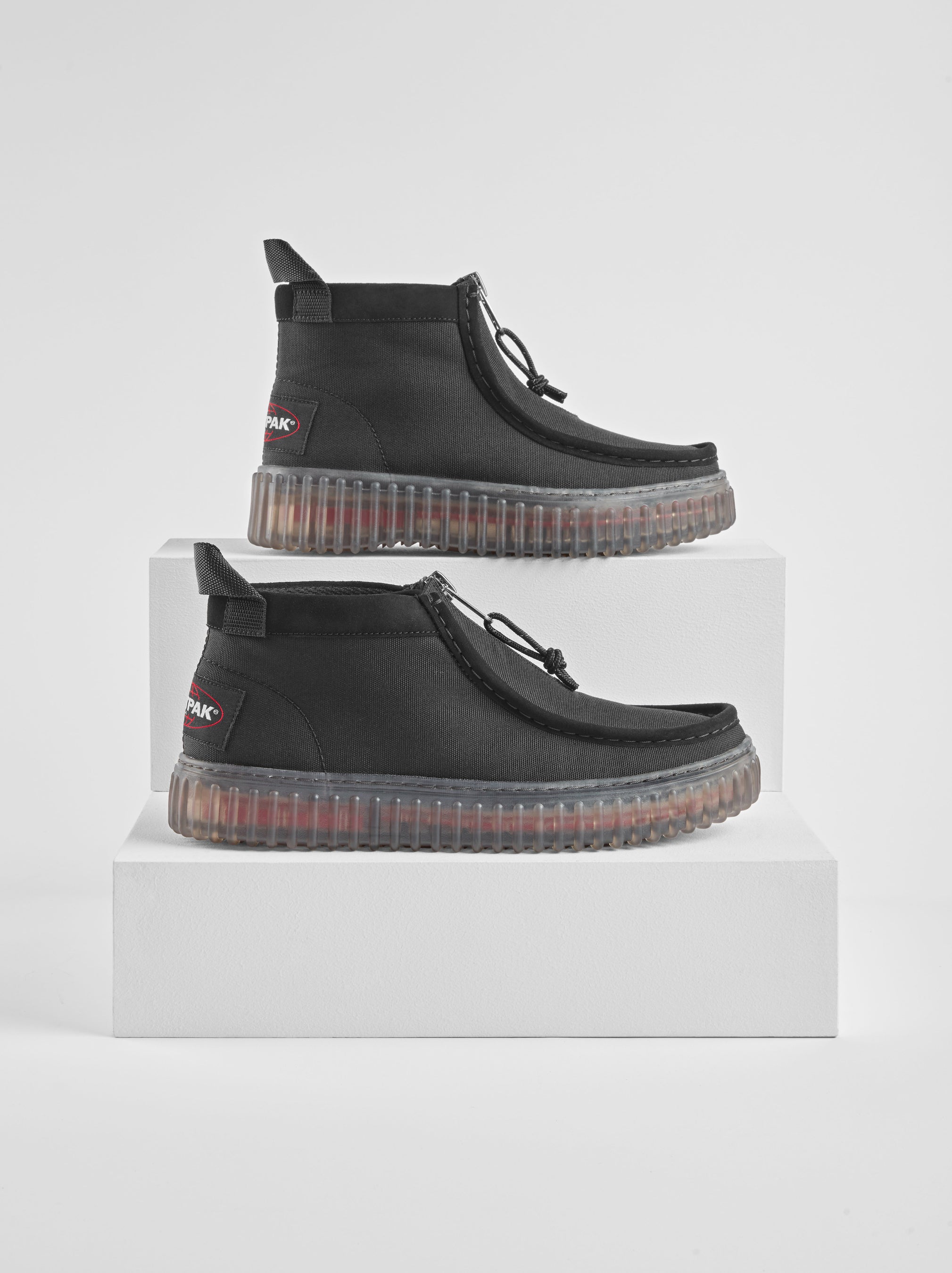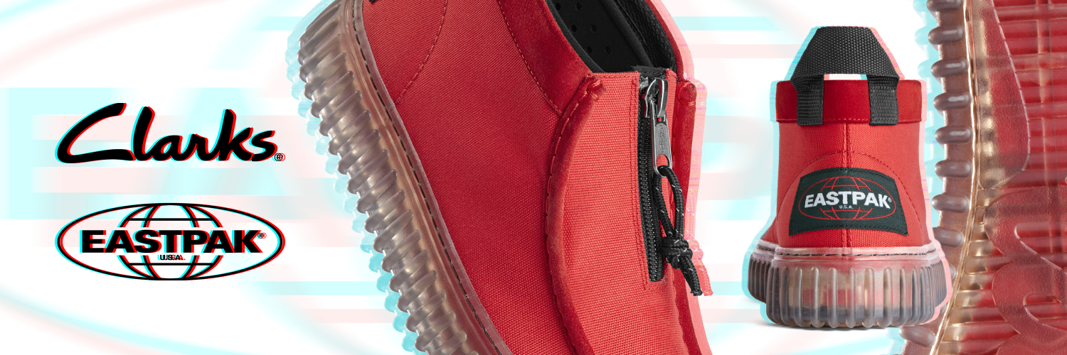 クラークスの2つのクラシックモデル(ワラビーと90年代生まれのビッググリッパー)からインスピレーションを得たコラボレーションモデルは、ウォータープルーフのキャンバス地を採用し、イーストパックのシグネチャーであるジッパー、キャリータグ、ウーブンラベルをあしらうことでクラークスらしい仕上げを施しています。また、製法により柔軟性を高め、取り外し可能なフットベッドと耐久性のあるアウトソールで軽やかで快適な歩行をサポートします。