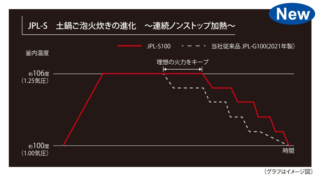 1970年に初代モデルを発売して以来、<炊きたて>シリーズは累計生産台数が7,200万台※1を超え、多くの皆さまにご支持いただいてまいりました。そして、“<炊きたて>史上、最高傑作”として2020年に誕生したJPL型は、「家電大賞 2020-2021」炊飯器部門・金賞の受賞をはじめ、2021年度は、「家電批評」2021年度ベストバイオブザイヤー、「MONOQLO」2021年度ベストバイオブザイヤーなど、家電系アワードで累計8 冠※2を達成しているタイガー最上位モデルとなります。新発売となる「土鍋ご泡火炊きJPL-S100」は、最高温度約280度※3でごはんの甘みをより深く引き出す「土鍋ご泡火炊き」に新技術「連続ノンストップ加熱」を採用しました。これまで吹きこぼれが原因で断念していた理想の火力を、独自開発の「ハリつやポンプ」から、フタ内部に風を送ることで解決し、薪火で炊きあげるようなかまどごはんの味を炊飯器で実現。当社従来品に比べて約106度(約1.25気圧時)の状態を、約1.5倍※4も長く維持することに成功しました。タイガーが理想とする大火力でじっくりと炊きあげることで、お米のα化(糊化)を促進し、ごはんの深い甘みと、ほどよい粘りを引き出します。甘みは、当社従来品比・約17%アップ※5、粘りも約3%アップ※6いたしました。