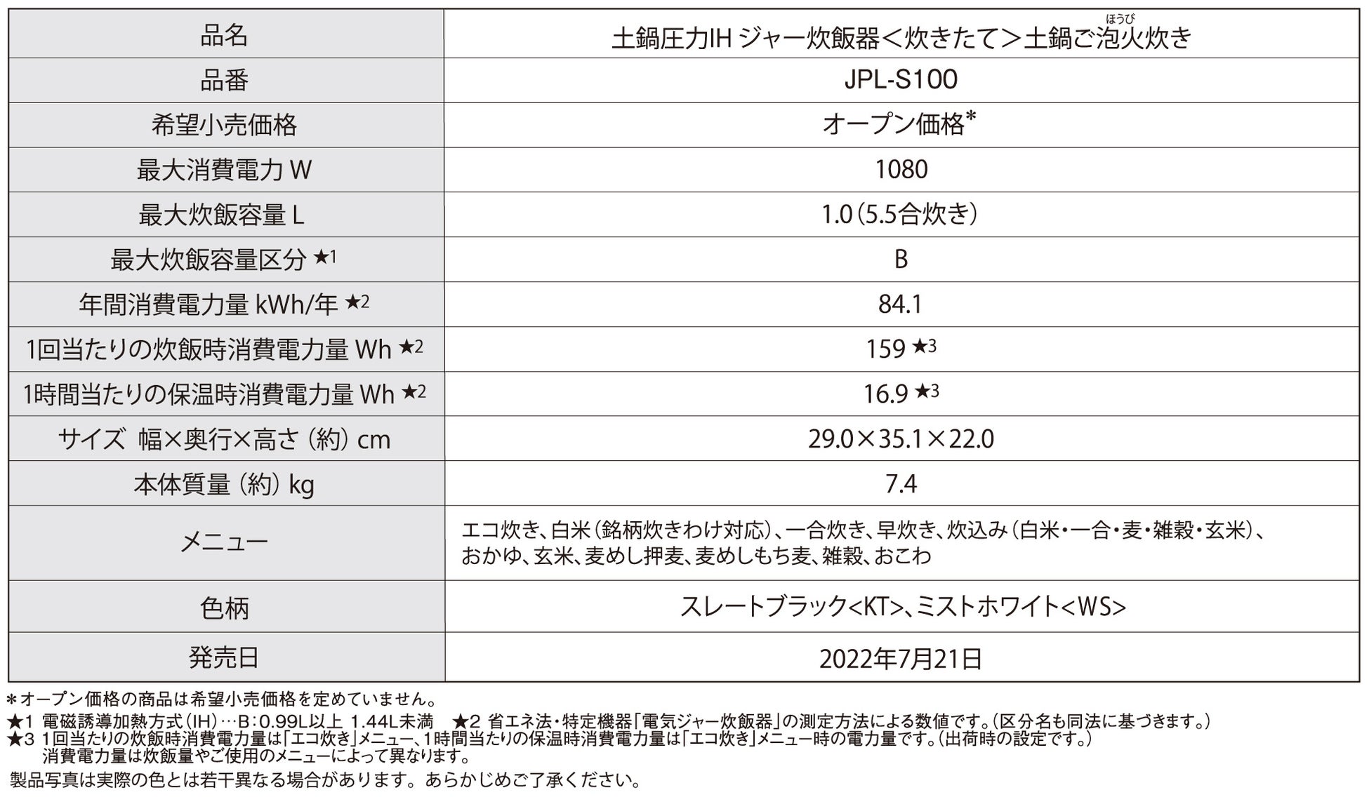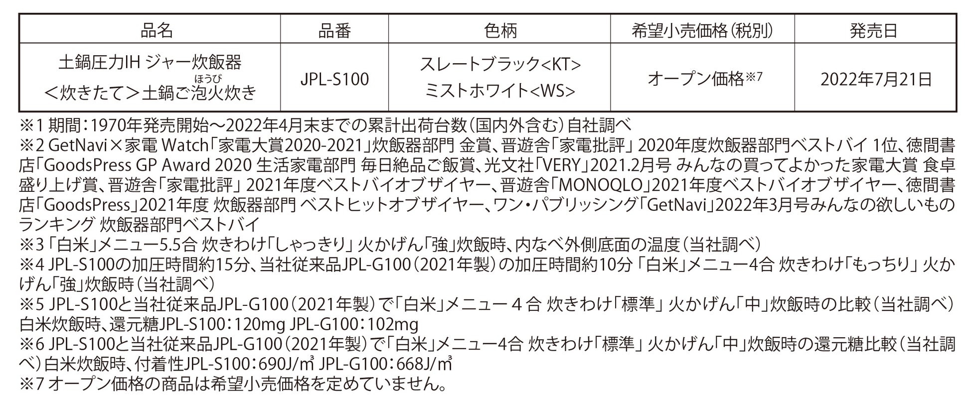 <炊きたて>史上、最高傑作の記念モデルが登場!「土鍋圧力IHジャー炊飯器<炊きたて>土鍋ご泡火炊き JPL-S100」2022年7月21日発売