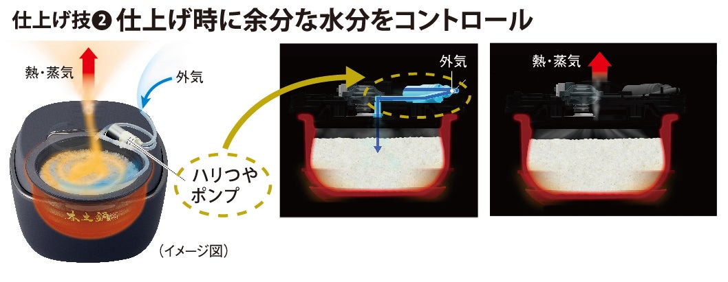 高温蒸らし時に外気を取り込み、過剰な熱と蒸気を除いて、余分な水分をコントロール。「間欠(かんけつ)呼吸」で高温を維持しながら仕上げ、ごはんのハリと弾力を保ちながらもお米本来の甘みを引き出します。