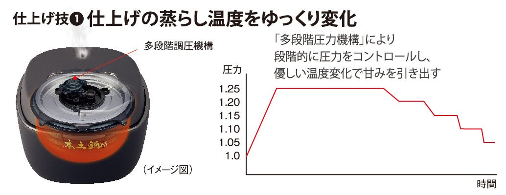 段階的に圧力をコントロールすることで、仕上げ段階の蒸らし温度を高く維持させながら、やさしく温度変化させ、お米の甘みを引き出します。
