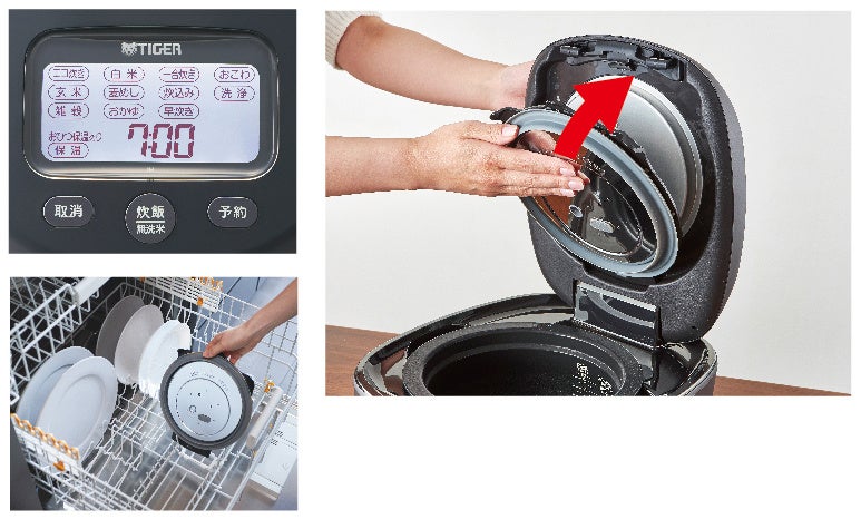 お手入れ点数は、内なべと内ぶたのみのたったの2点。部品の取り外しも簡単です。ストレスフリーな使い心地の「マグネット式着脱内ぶた」は、手を離せばスッと本体に装着できます。内ぶたは食器洗い乾燥機にも対応し、毎日のお手入れ性にもこだわっています。