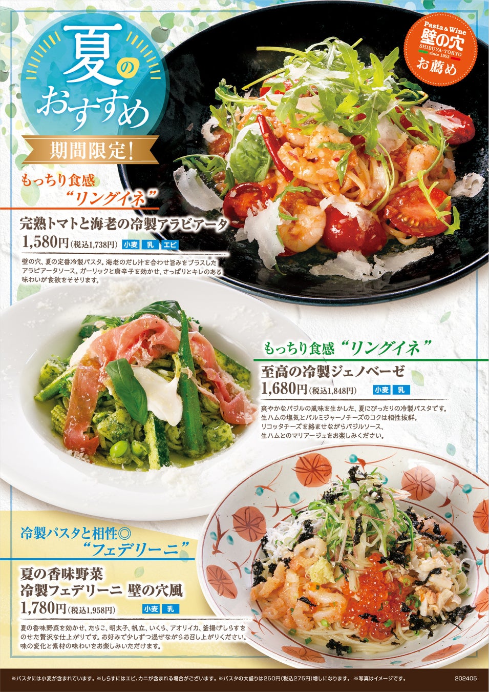 アルデンテの食感にこだわる「壁の穴」夏のおすすめ“冷製パスタ”3種 6/3(月) より販売開始いたします