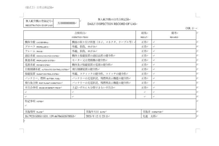 ■様式1(飛行実績記録):飛行データの記録作業の効率化