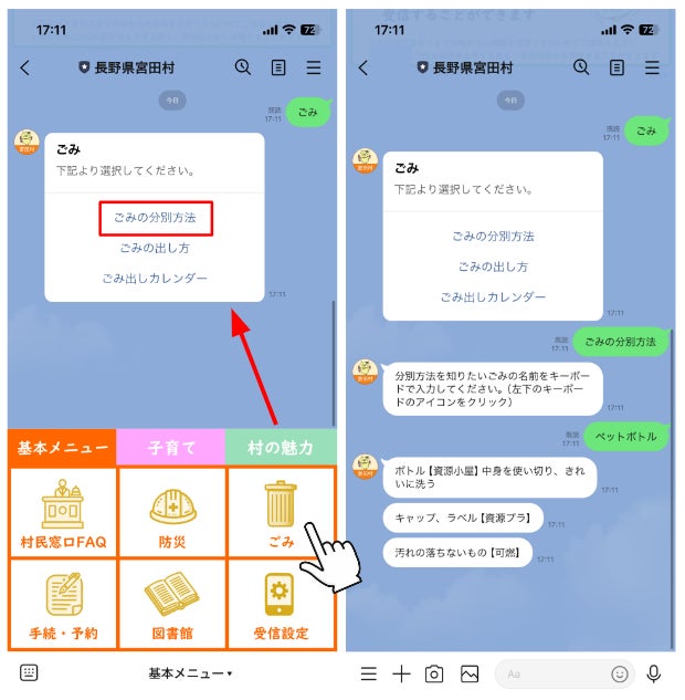 「チャットボット機能」では「ごみの分別方法」を調べることができます。分別したいごみの種別を入力すると「ごみの分別方法」を自動で回答します。