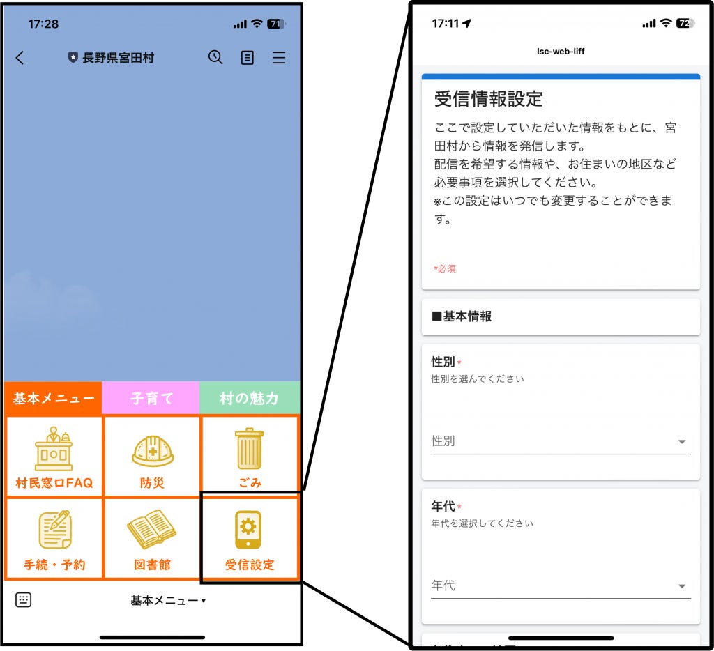 友だち追加をしたユーザーは受信設定に回答することで、受け取る配信の情報カテゴリーをカスタマイズすることができます。様々な村政情報を効果的に受信することができ、重要な情報を逃しません。