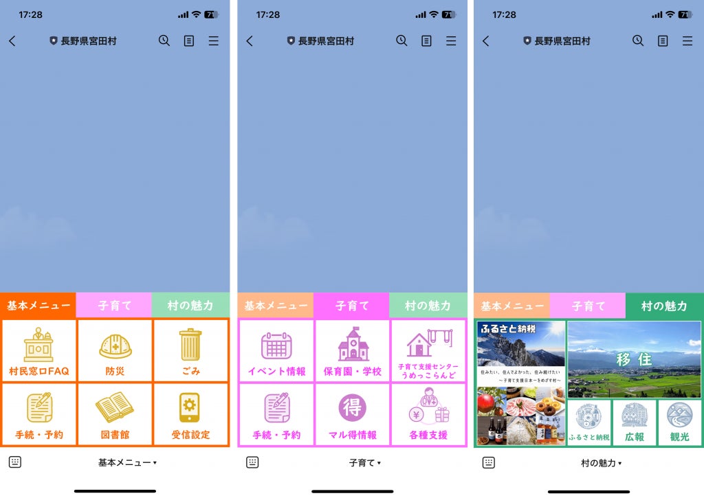 画面下部に固定されている「基本メニュー」「子育て」「村の魅力」の3つのリッチメニューから、各種情報が掲載されているWebサイトに遷移することができます。
