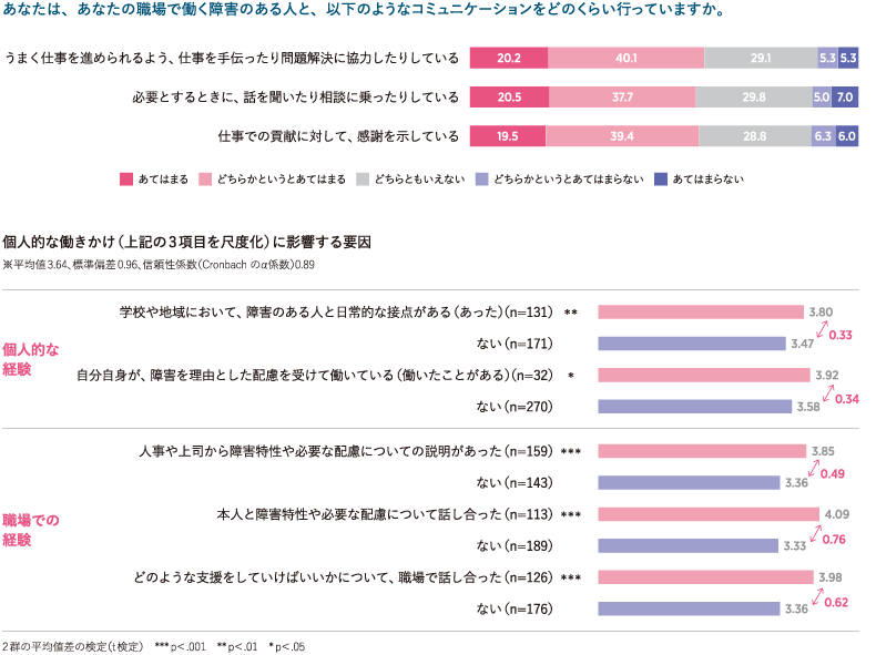 ・「学校や地域において、障害のある人と日常的な接点がある(あった)」や「自分自身が、障害を理由とした配慮を受けて働いている(働いたことがある)」といった、個人的に障害のある人に対する理解を深める経験の有無により、働きかけの程度には一定の差が見られた。