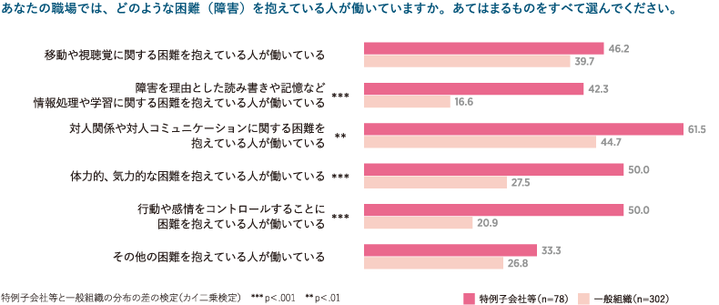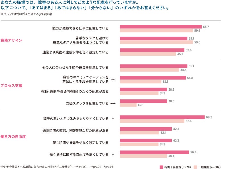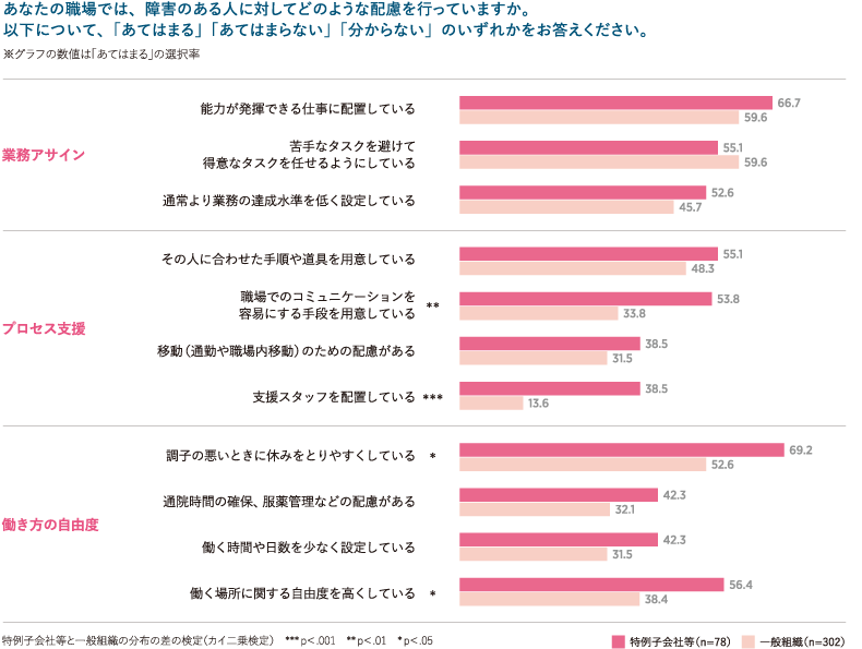 ・ 一方で、両群間で実施率の差が大きかったのは、「支援スタッフを配置している(特例子会社等38.5%、一般組織13.6%)」「職場でのコミュニケーションを容易にする手段を用意している(同53.8%、33.8%)」「働く場所に関する自由度を高くしている(同56.4%、38.4%)」「調子の悪いときに休みをとりやすくしている(同69.2%、52.6%)」だった。