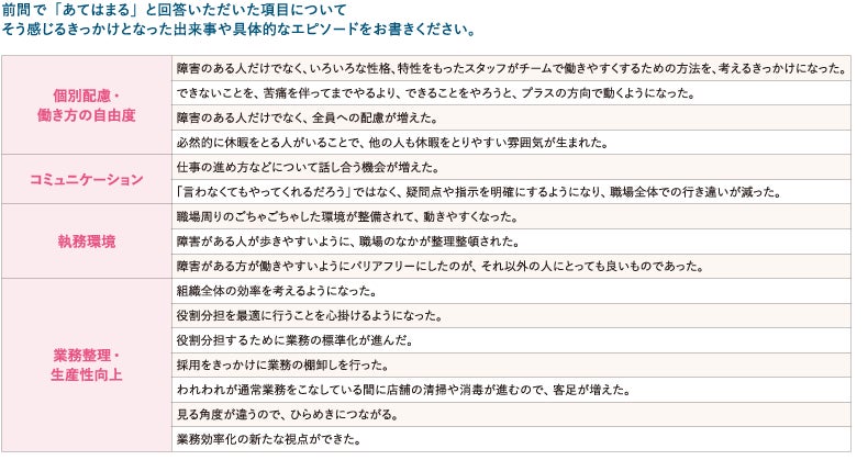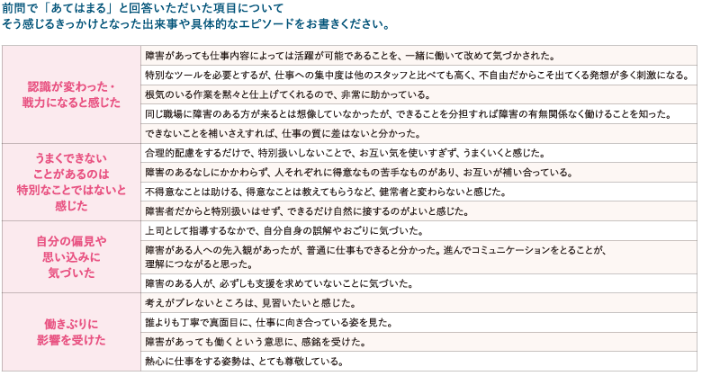 ⇒誰にでも得意なこと不得意なことがあることを再認識し、それぞれの力をより発揮できるような工夫を、職場として行っていくきっかけとなっているようだ。「必然的に休暇をとる人がいることで、他の人も休暇をとりやすい雰囲気が生まれた」「障害のある人だけでなく、全員への配慮が増えた」なども、障害がある人の就労が、すべての人にとって働きやすい職場の実現につながっている例だろう。